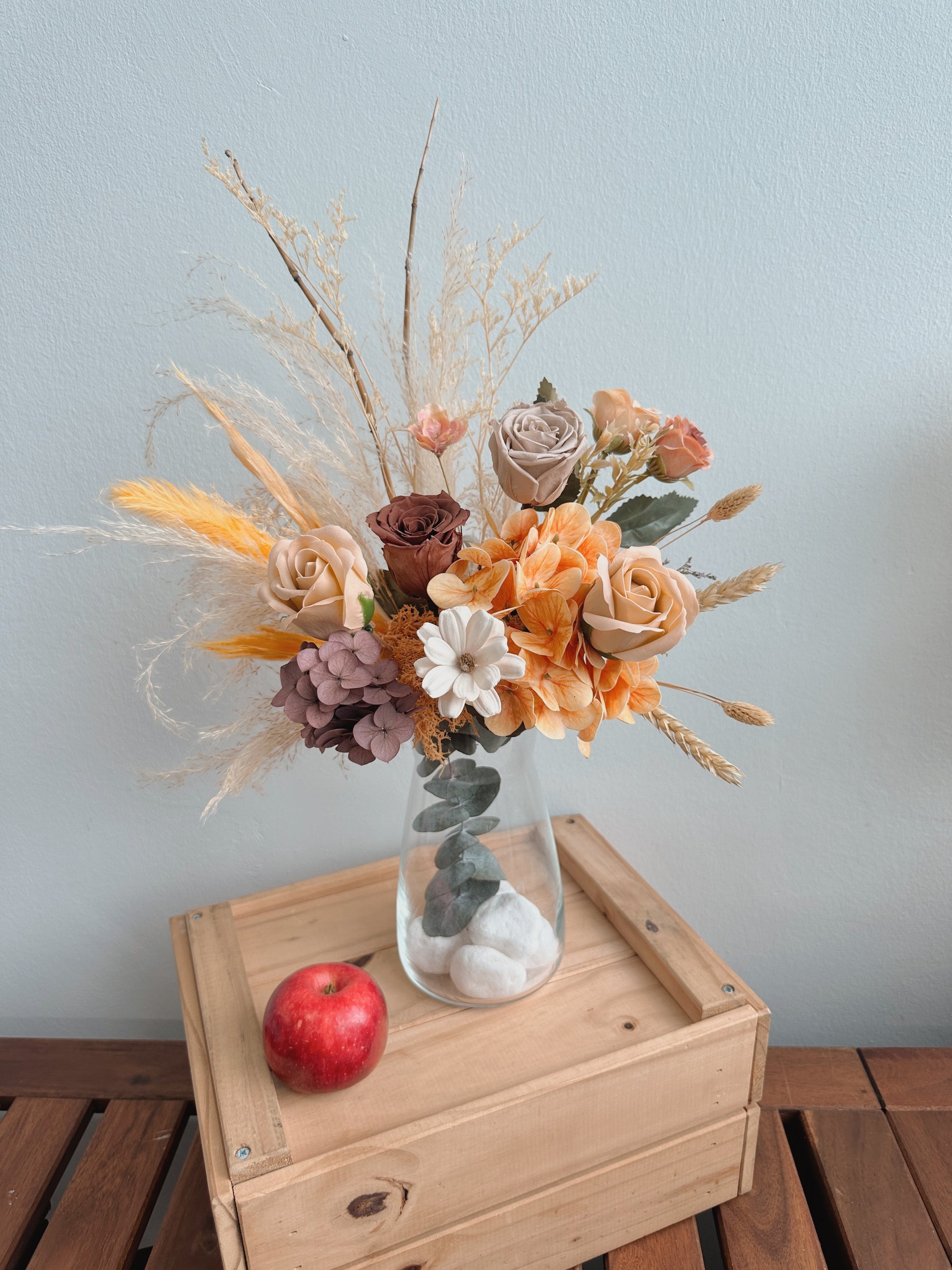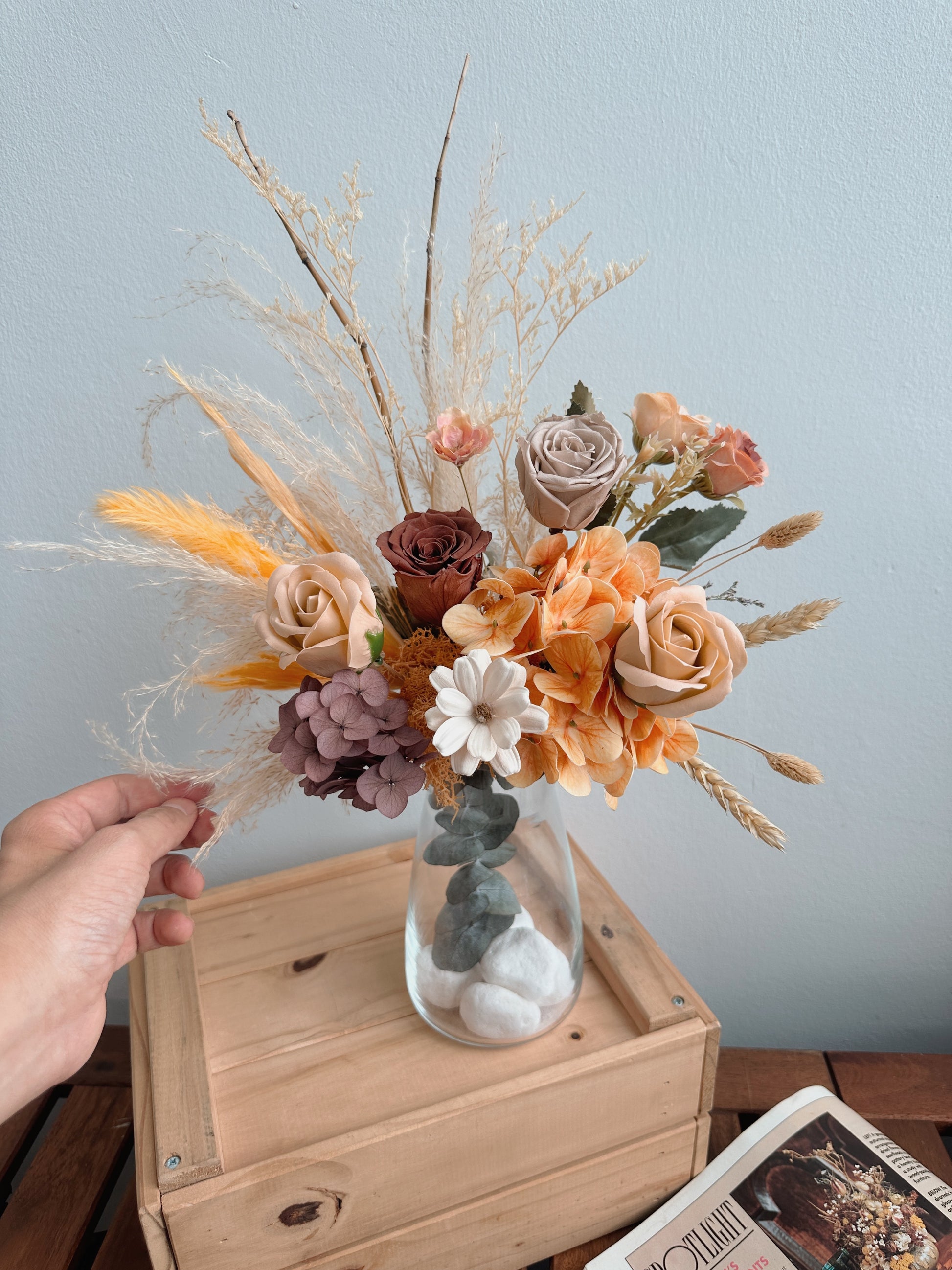 Amara expresses a quiet, everlasting love through soft earthy tones and gentle textures. Featuring preserved brown and khaki roses, soap khaki roses, brown preserved hydrangeas, orange faux hydrangea, preserved pampas, preserved caspia, dried wheat, and delicate man-made flowers, this arrangement brings warmth, calm, and romance together.