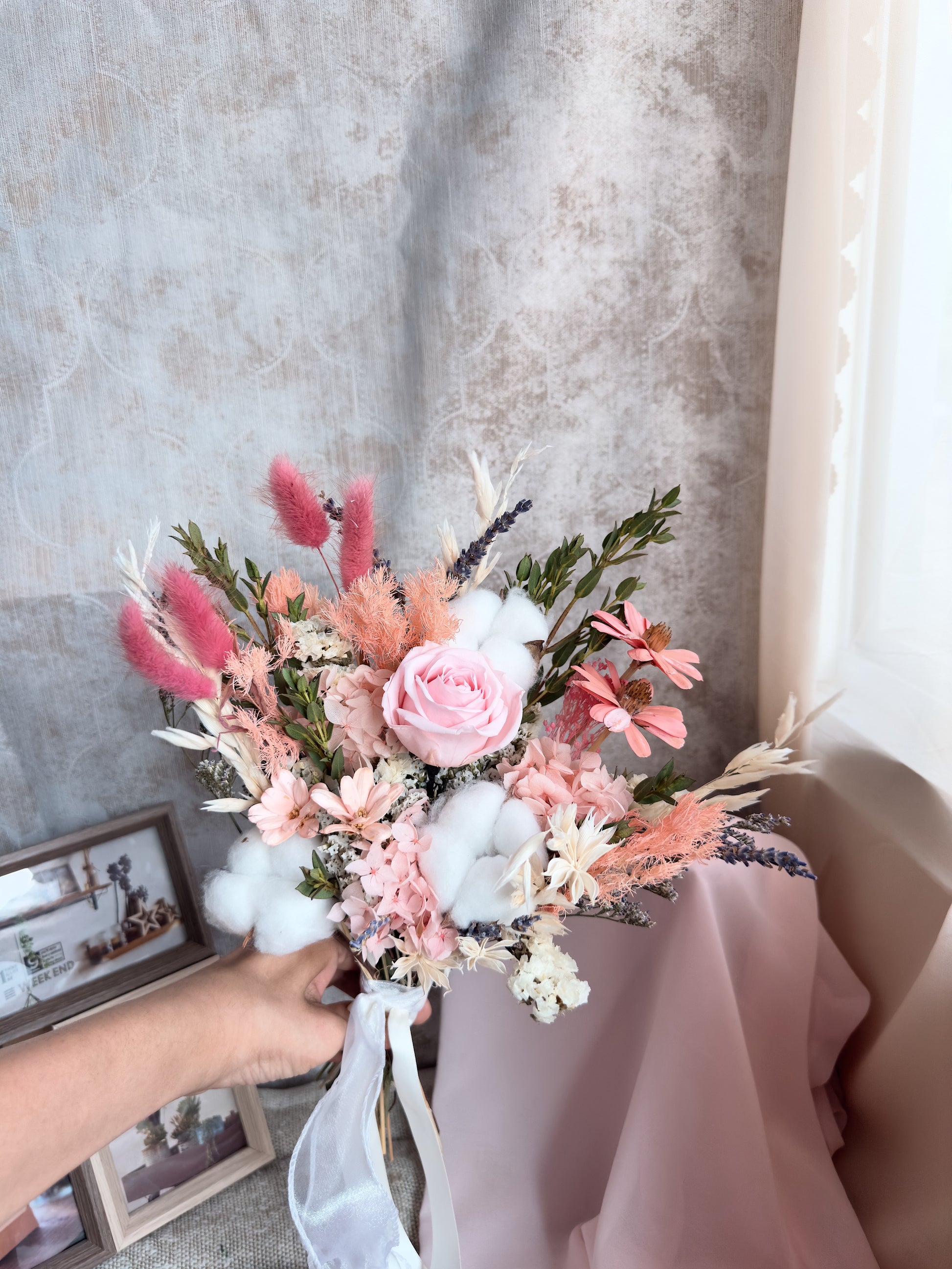 This "Boundless Light Pink" consists of light pink rose, 3 cotton flower, dried statice, nuts flower, ruscus, preserved pink hydrangeas, pink mint fern, dried caspia, dried lavender, white oats and other fillers