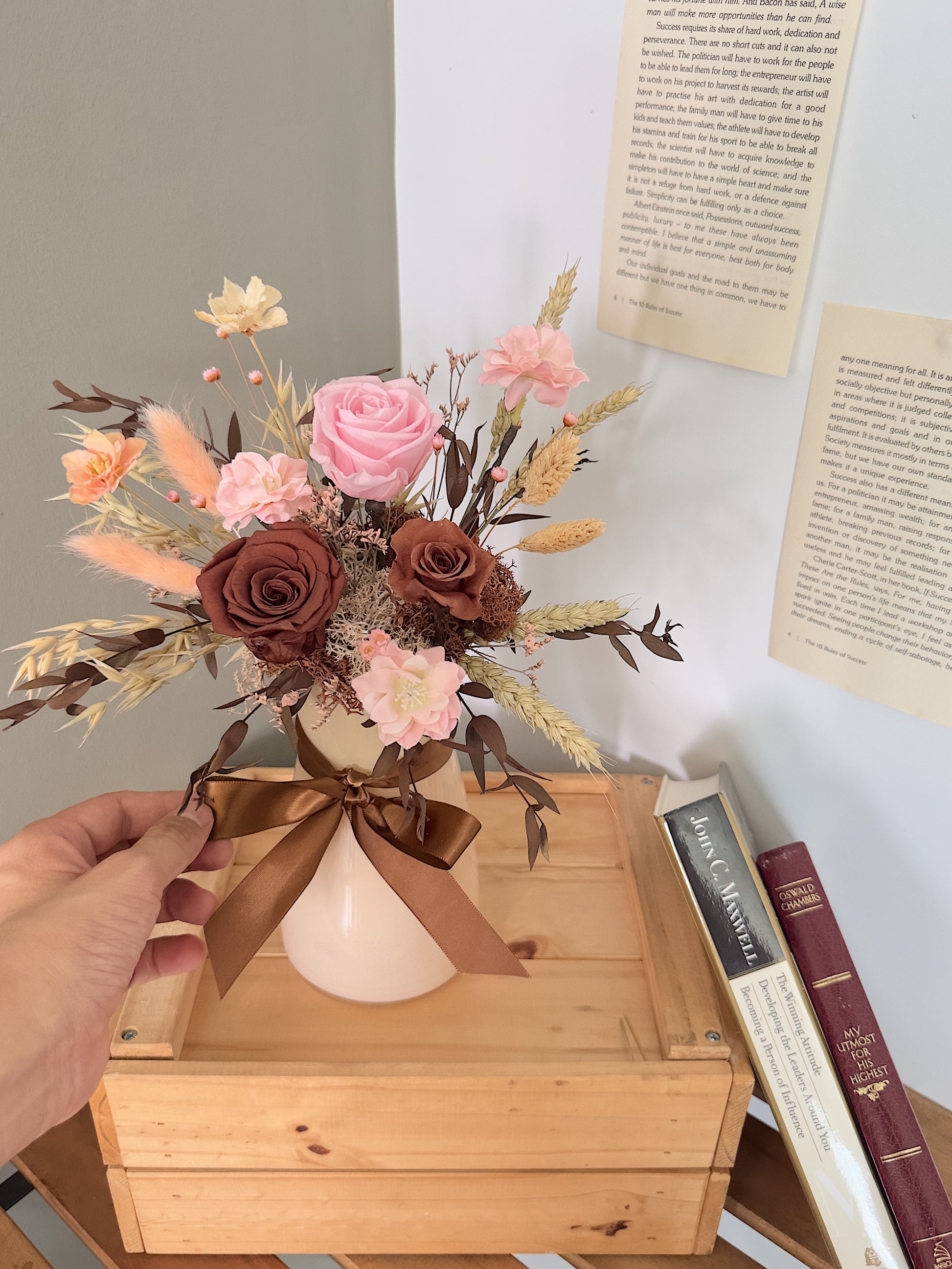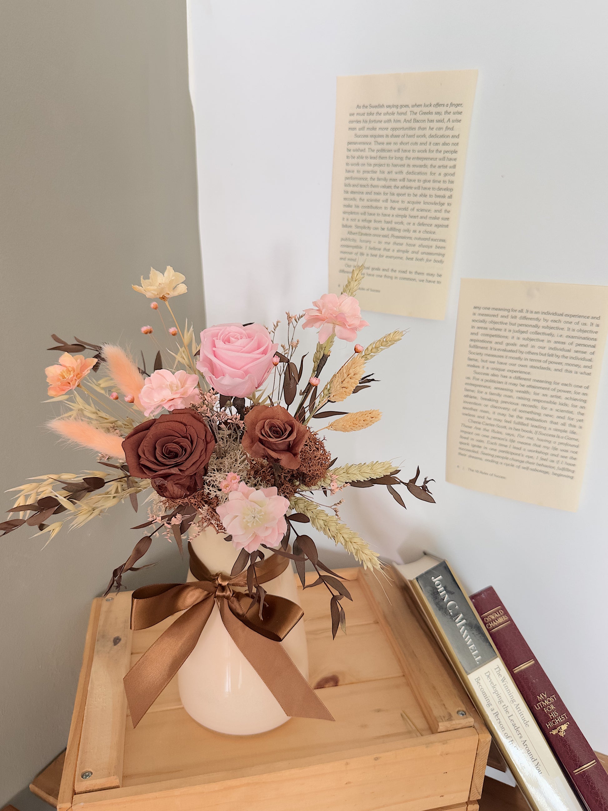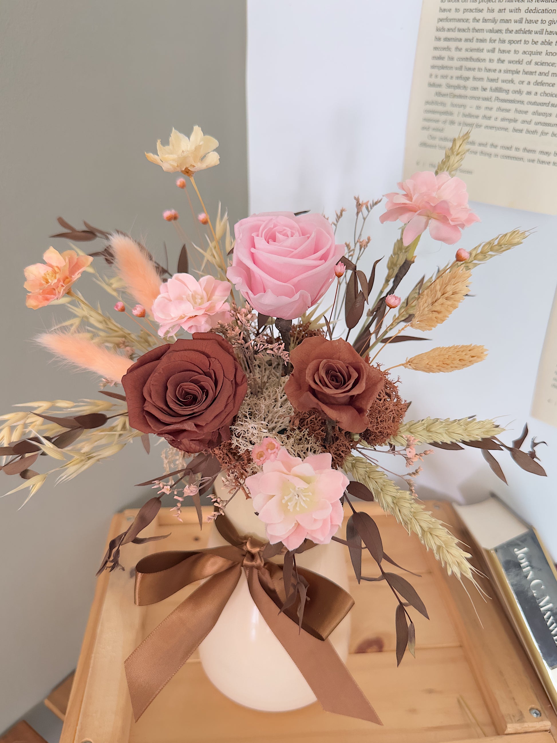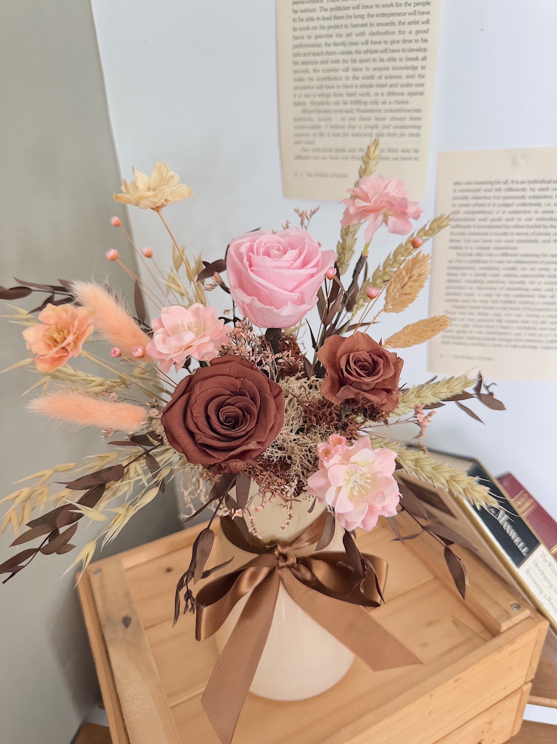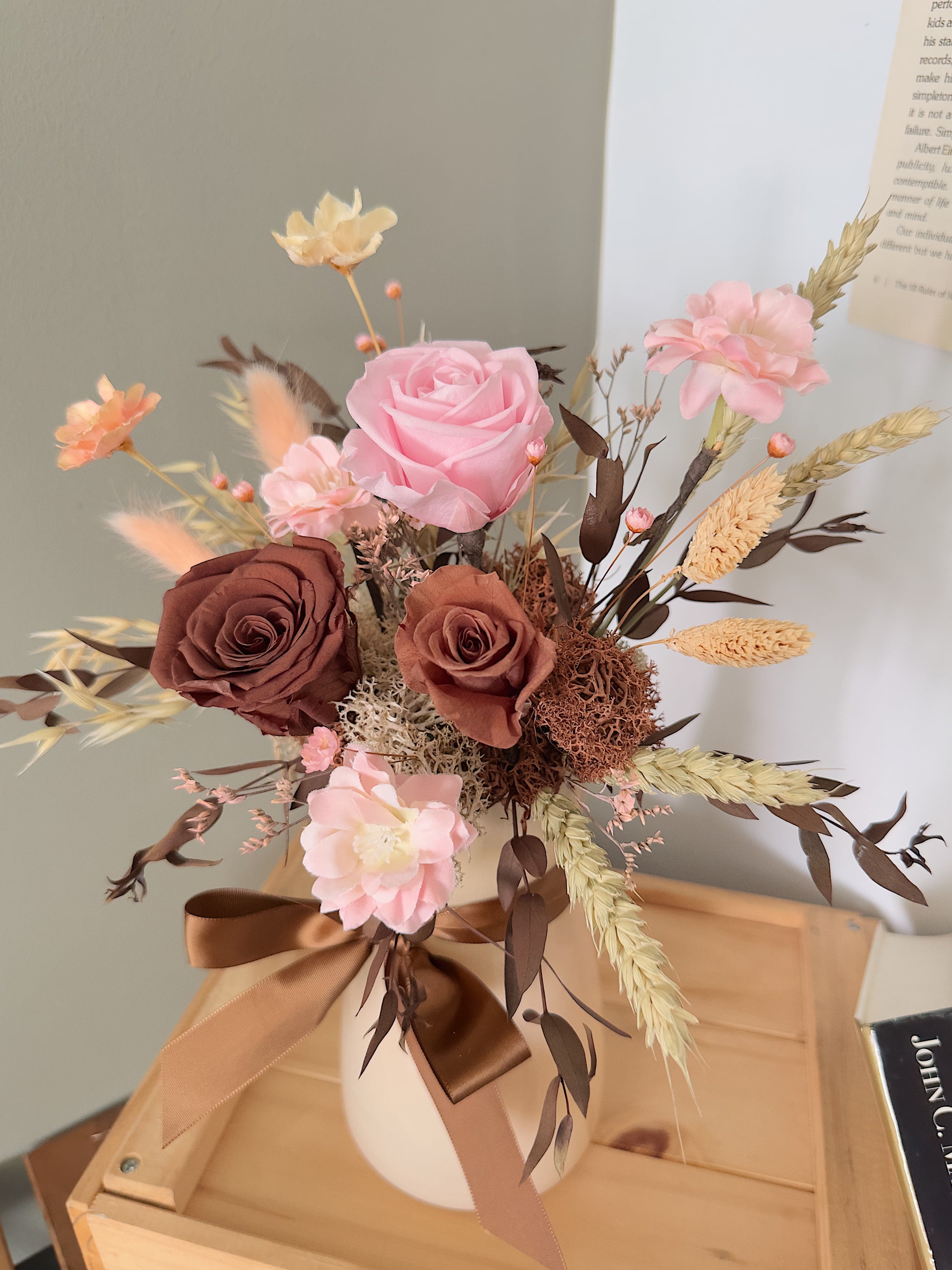 At its heart lie preserved roses in shades of chocolate brown and soft pink—timeless symbols of affection. They’re gracefully nestled among preserved brown and khaki moss, dried wheat, avena oats, preserved bunny tails, faux filler flowers, and dried eucalyptus—each element adding texture, rhythm, and calm.