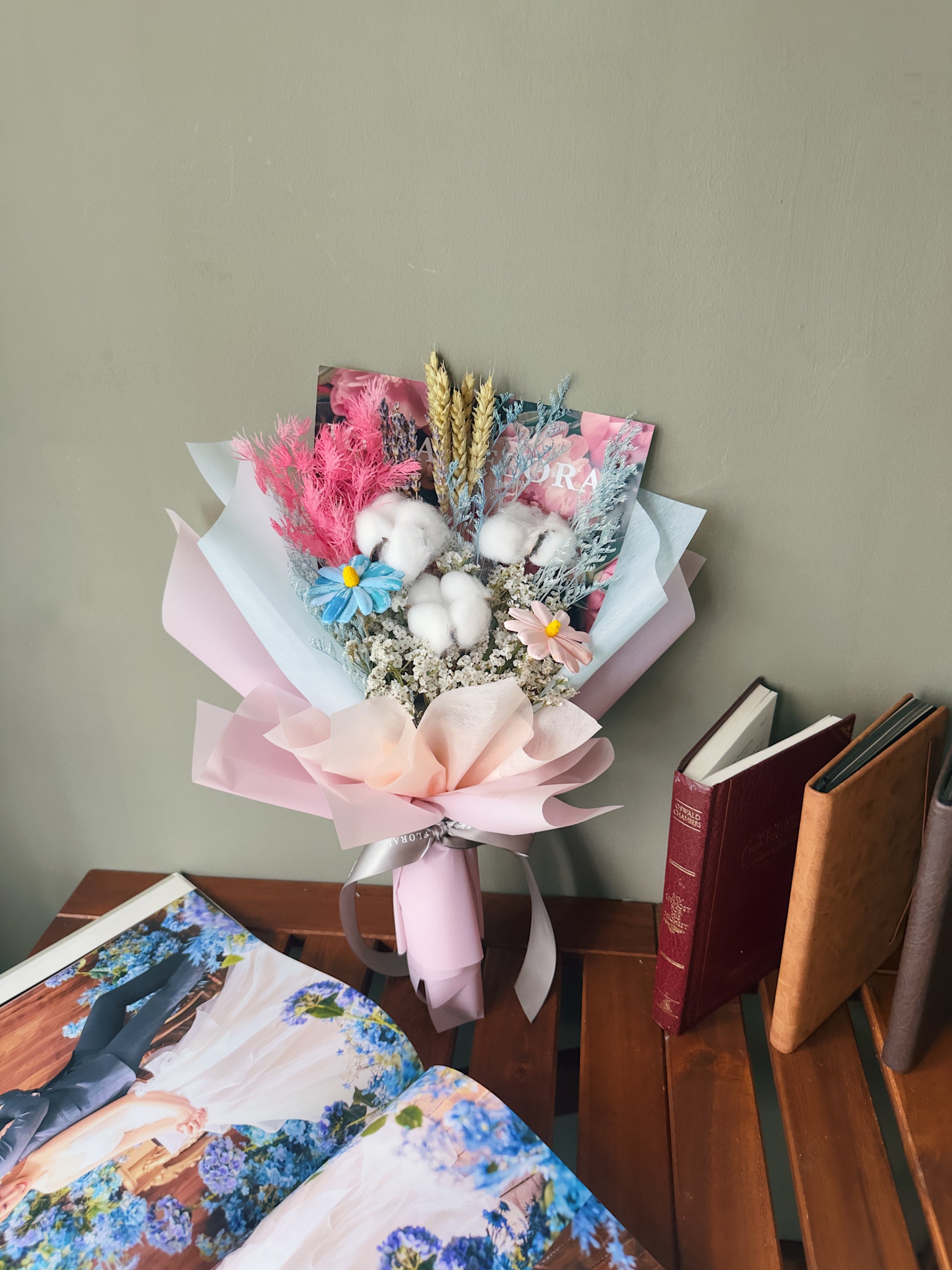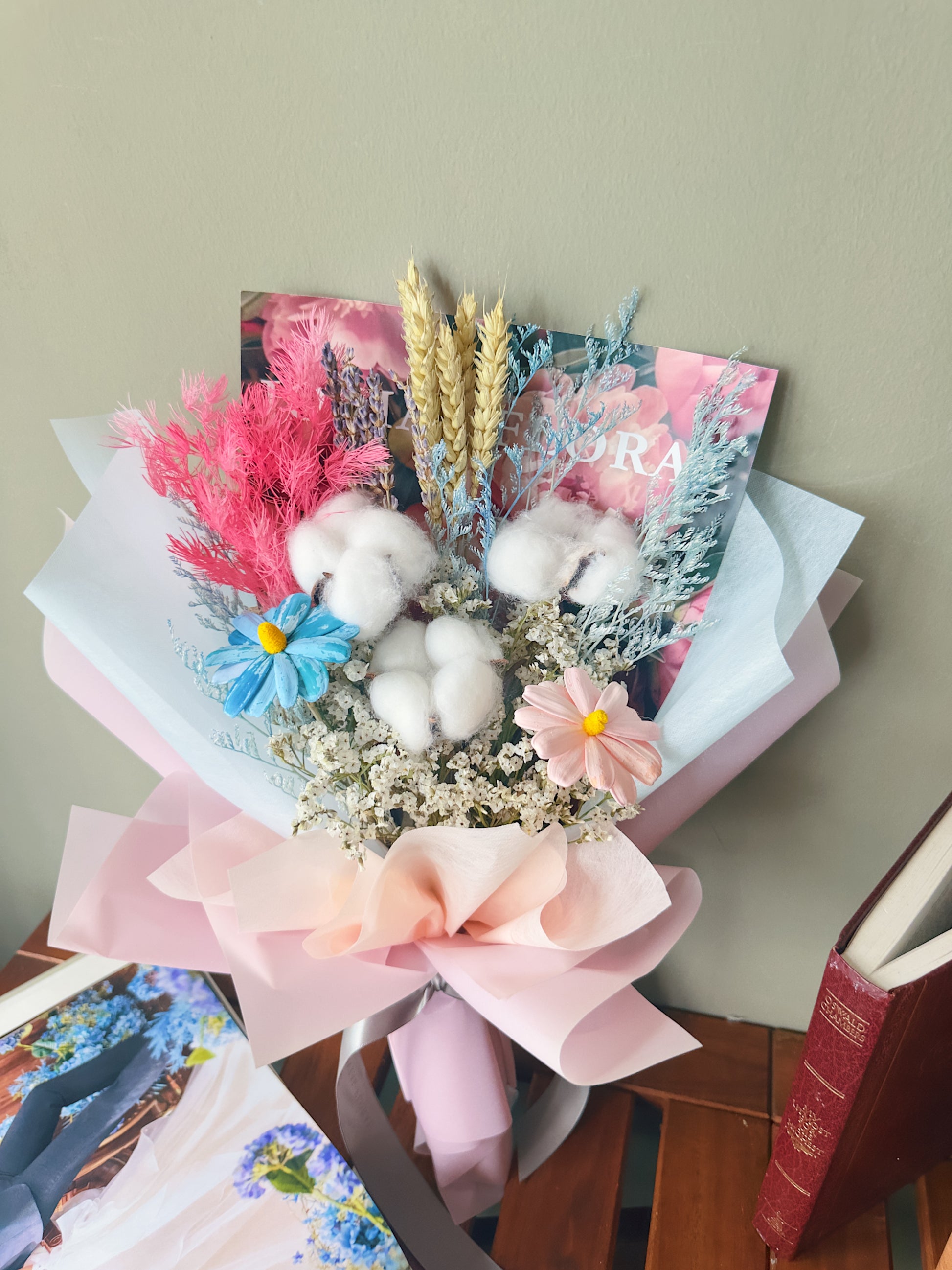 Light, airy, and oh-so-dreamy, Cloudy Candy is a delicate blend of soft textures and pastel hues. This bouquet features three fluffy cotton flowers, dried wheat, preserved Ming fern, two Japanese nuts flowers, lavender, dried caspia, and preserved blue caspia, creating a graceful and whimsical arrangement.