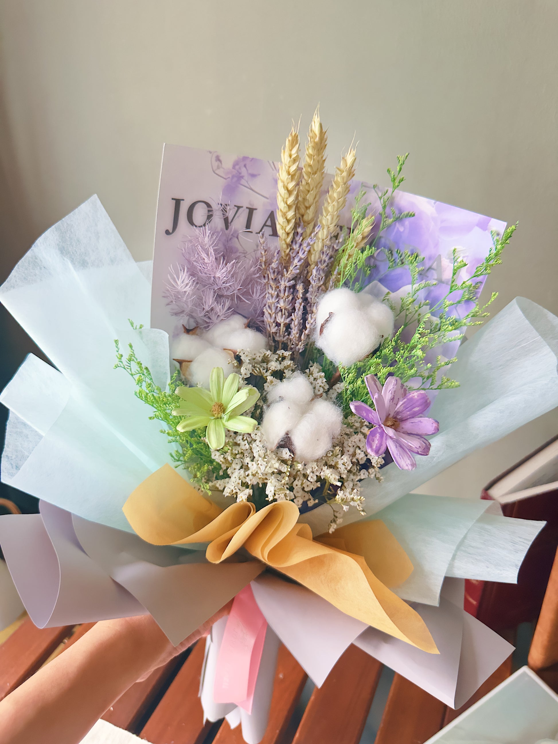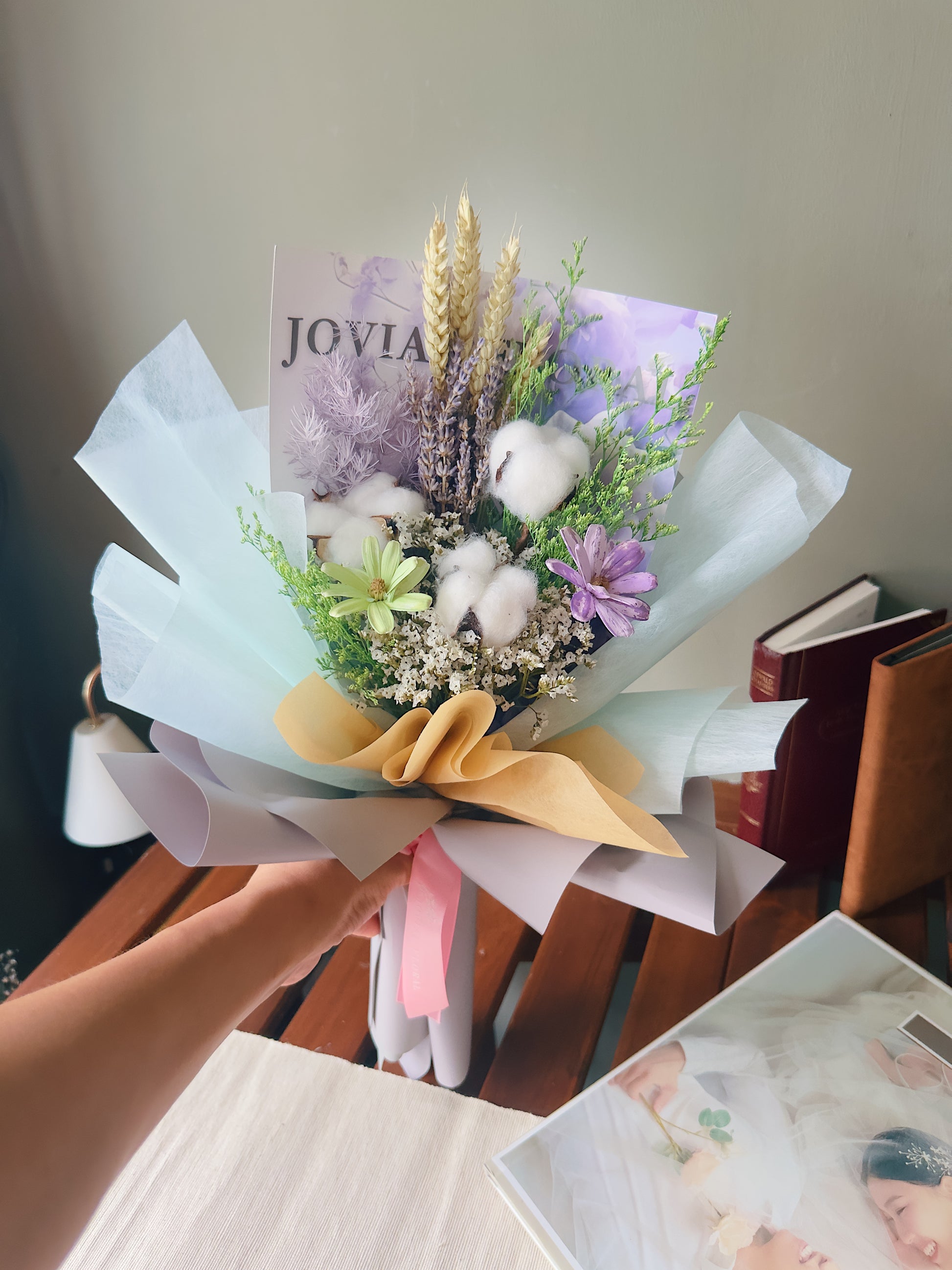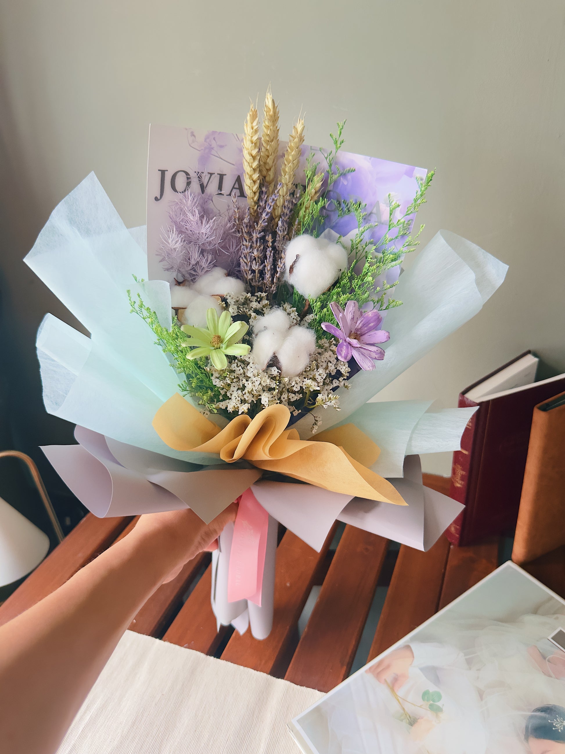 Elegant and serene, Cloudy Melody is a gentle symphony of natural textures and soft hues. This bouquet features three fluffy cotton flowers, dried wheat, preserved Ming fern, two Japanese nuts flowers, lavender, dried caspia, and preserved green caspia, creating a beautifully layered arrangement with a soothing and dreamy aesthetic.