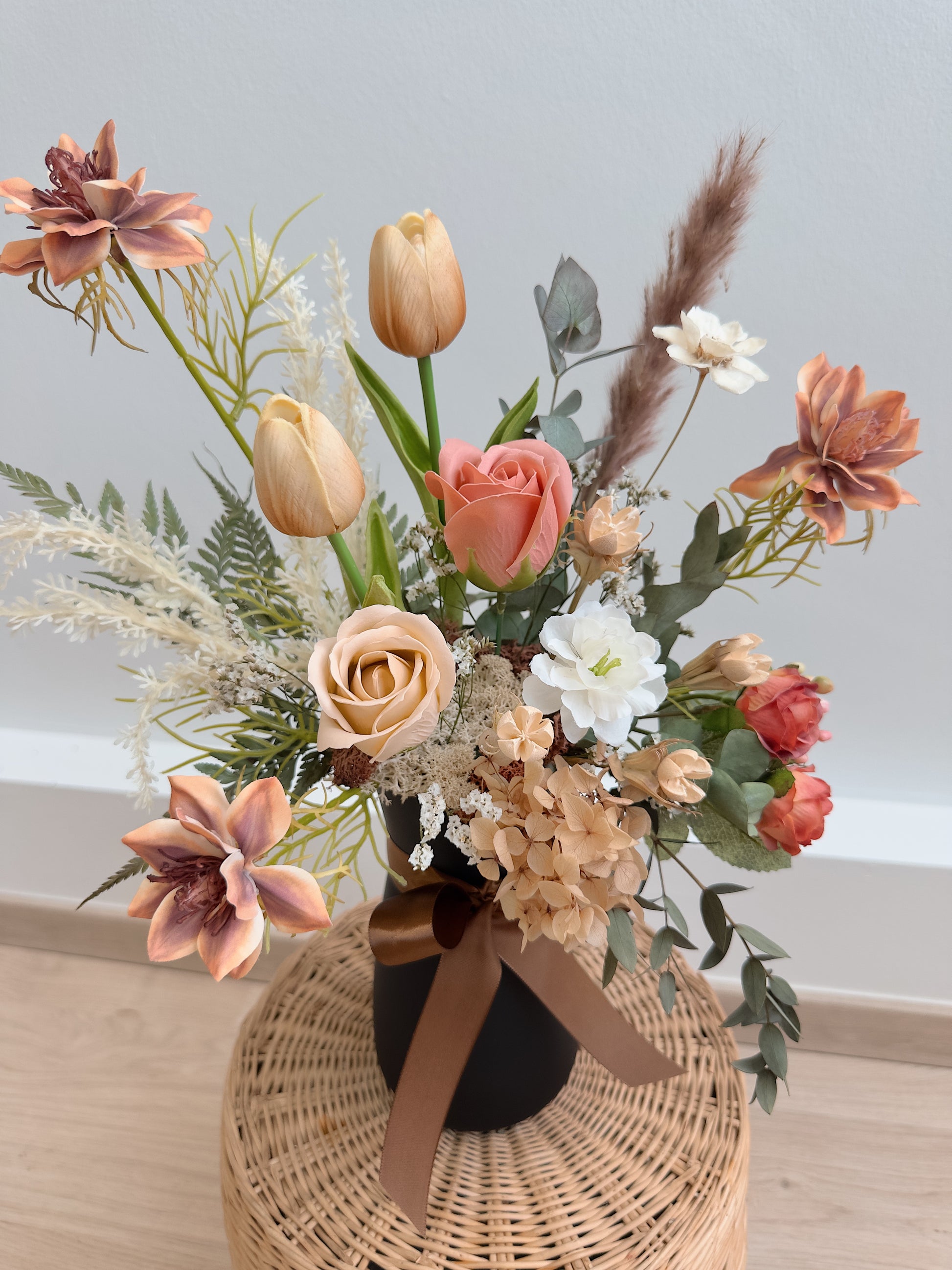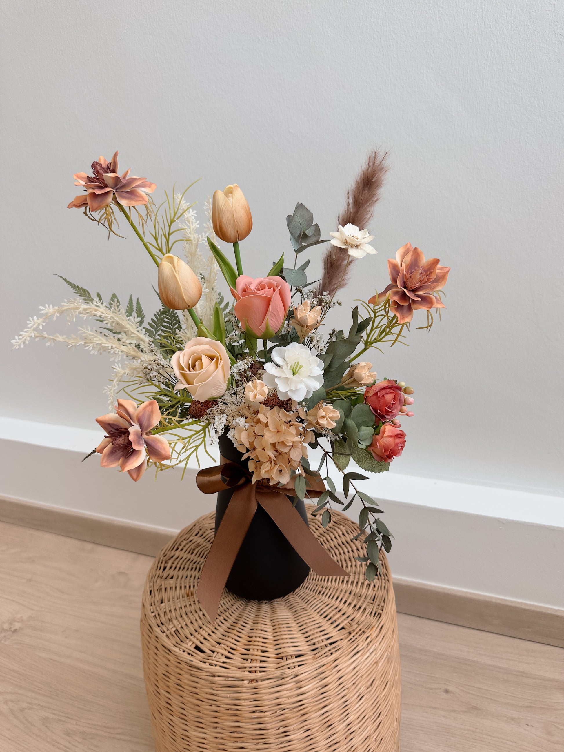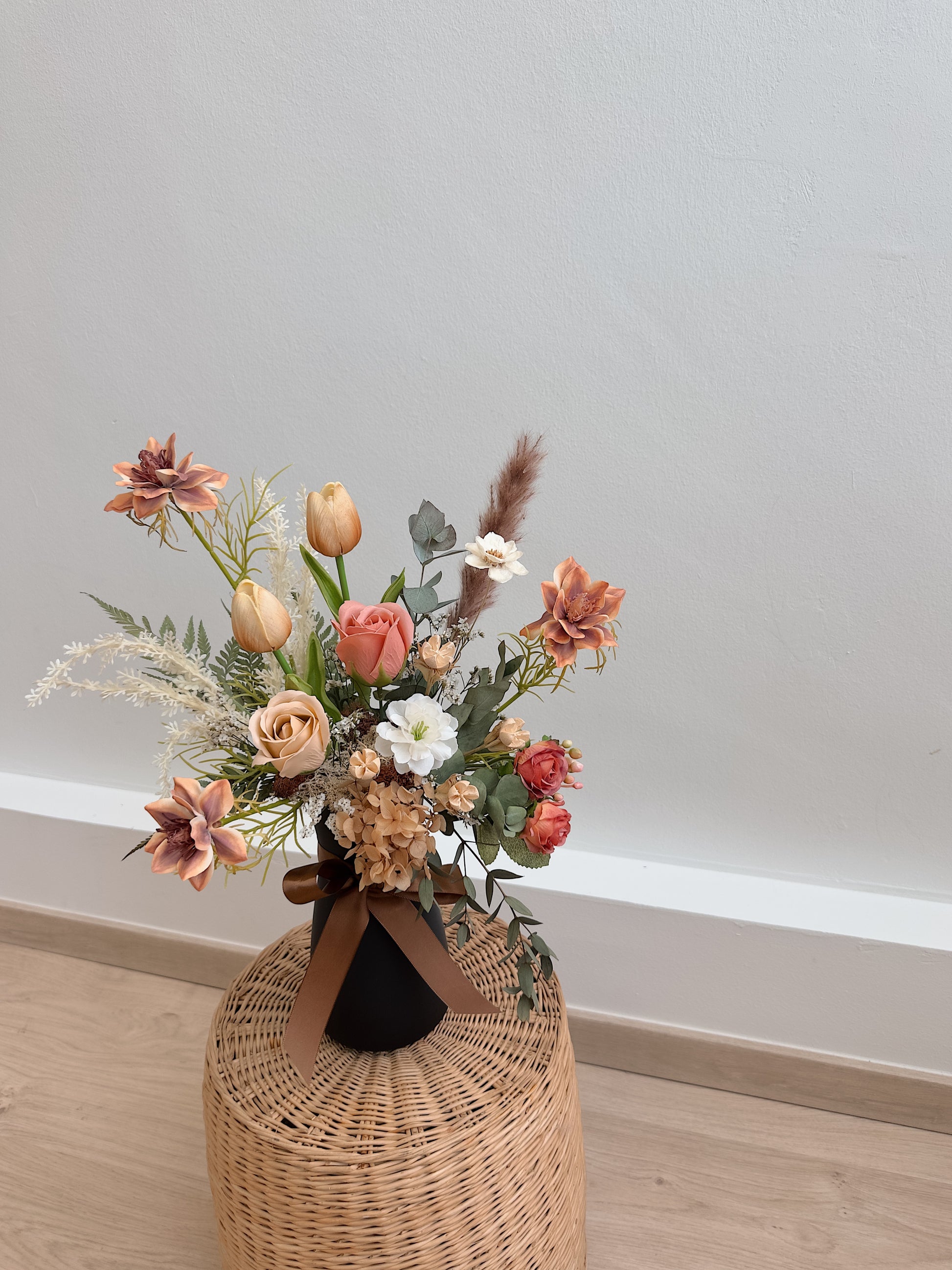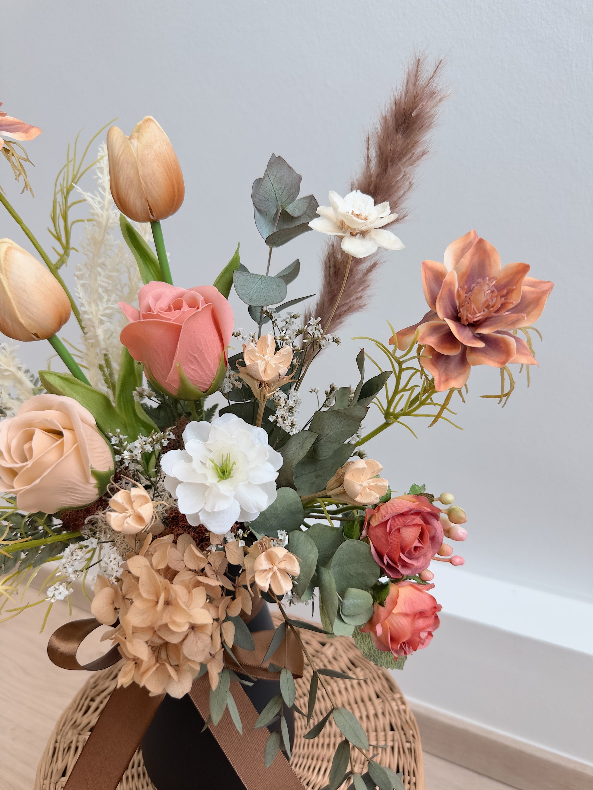 At its heart are khaki and coral soap roses, beautifully framed by khaki hydrangea, preserved moss, and faux tulips. Dried caspia, nigella, fern, eucalyptus, and brown pampas add natural texture, while faux nigella and filler blooms complete a harmonious, sophisticated arrangement.