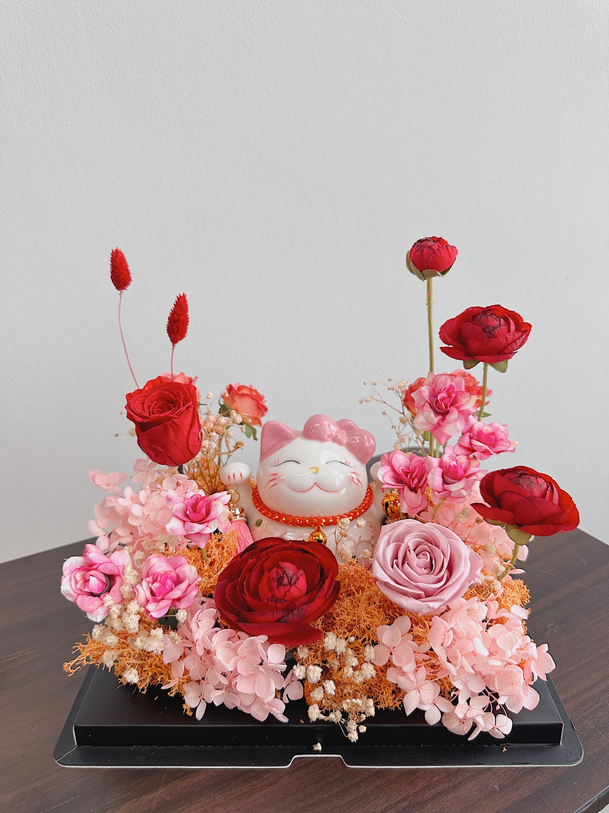 At the center rests a fortune cat, a beloved symbol of luck and prosperity, surrounded by a cheerful mix of blooms. Preserved red and pink roses, orange moss, pink hydrangeas, and baby’s breath create a lush foundation, while faux red ranunculus, pink carnations, and red bunny tails add playful texture and depth. Arranged using a grouping technique, each cluster highlights the beauty of the florals, creating a balanced and harmonious design.