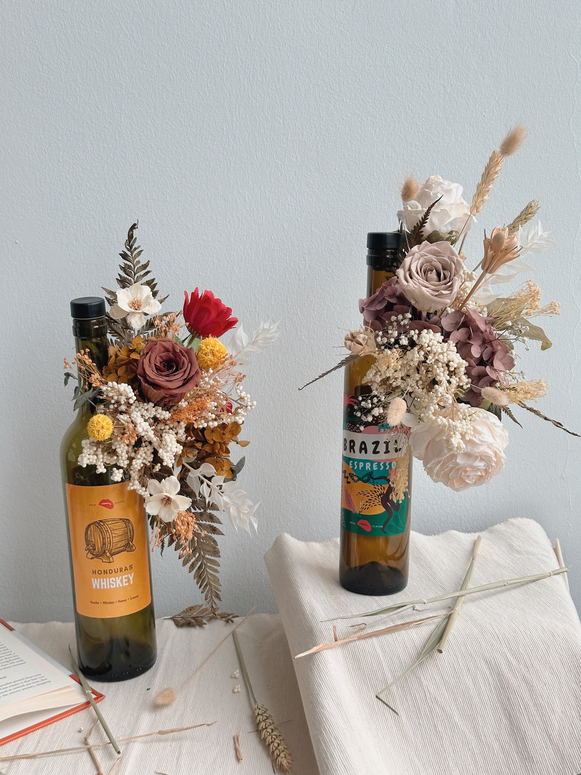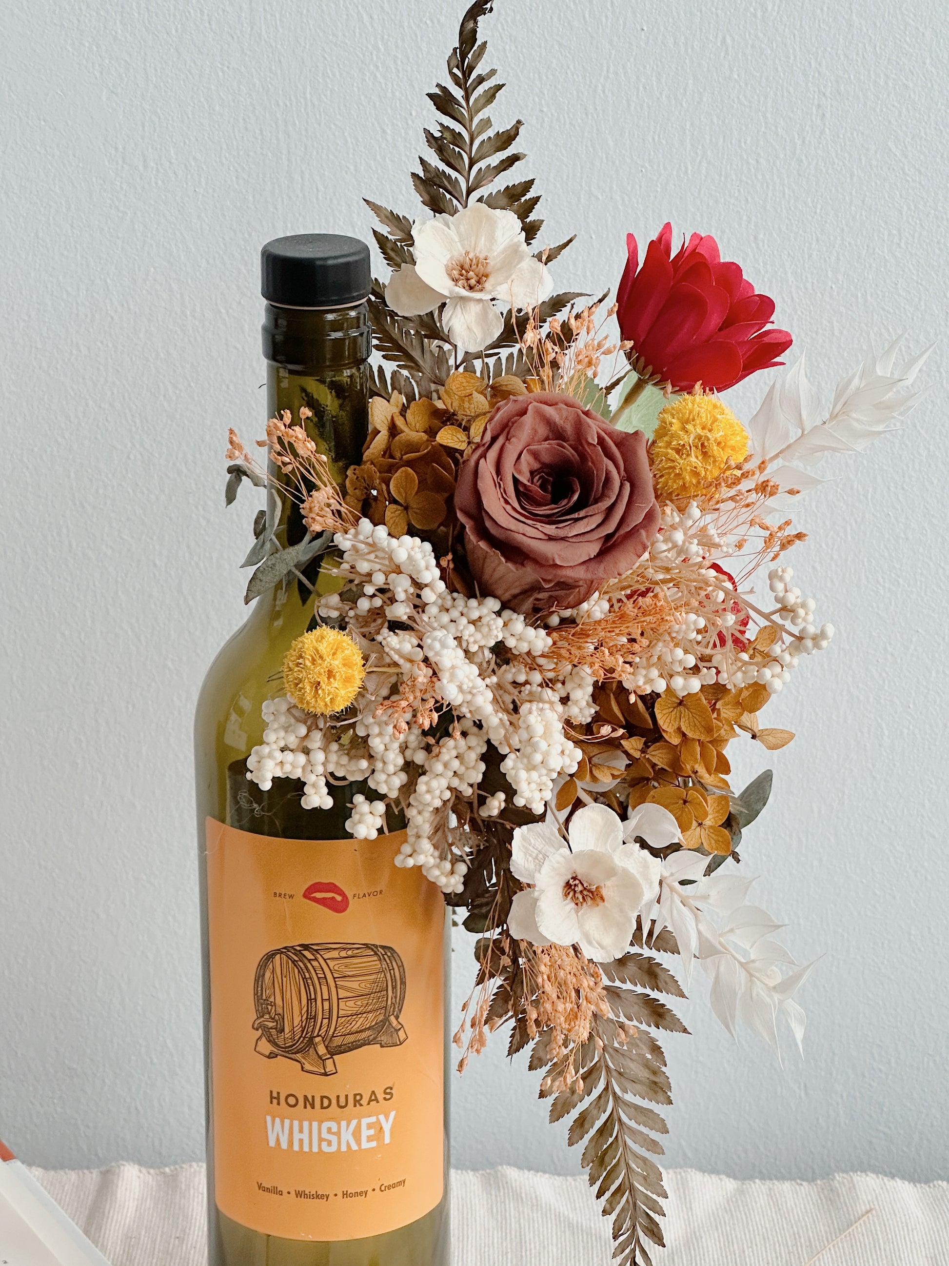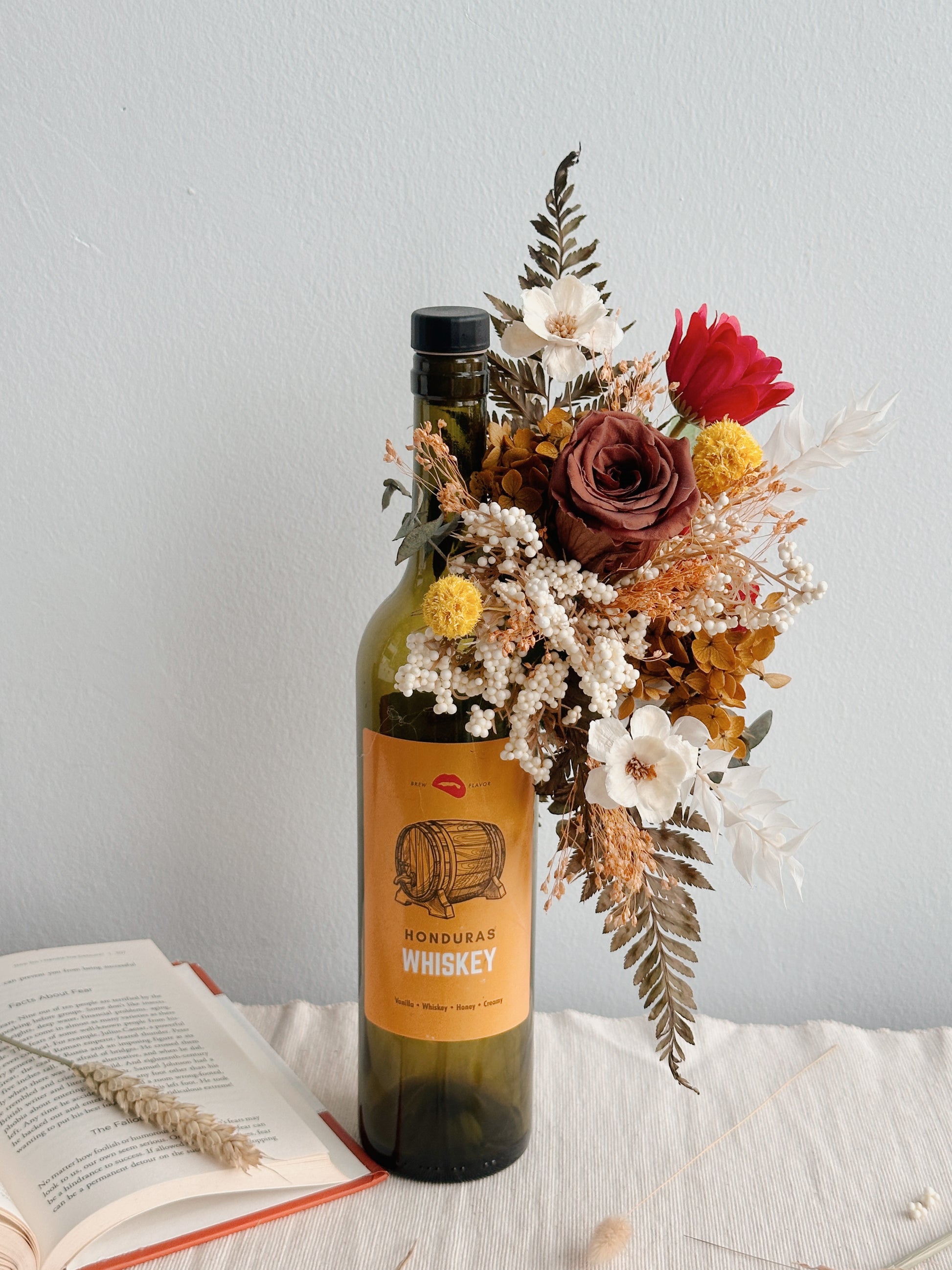 Presented in a wine-style glass bottle, this piece is elevated with a striking floral art arrangement in earthy brown, warm yellow, burnt orange, and a confident pop of red. The preserved and dried blooms add texture and richness, perfectly reflecting the bold yet smooth personality of the brew inside.
