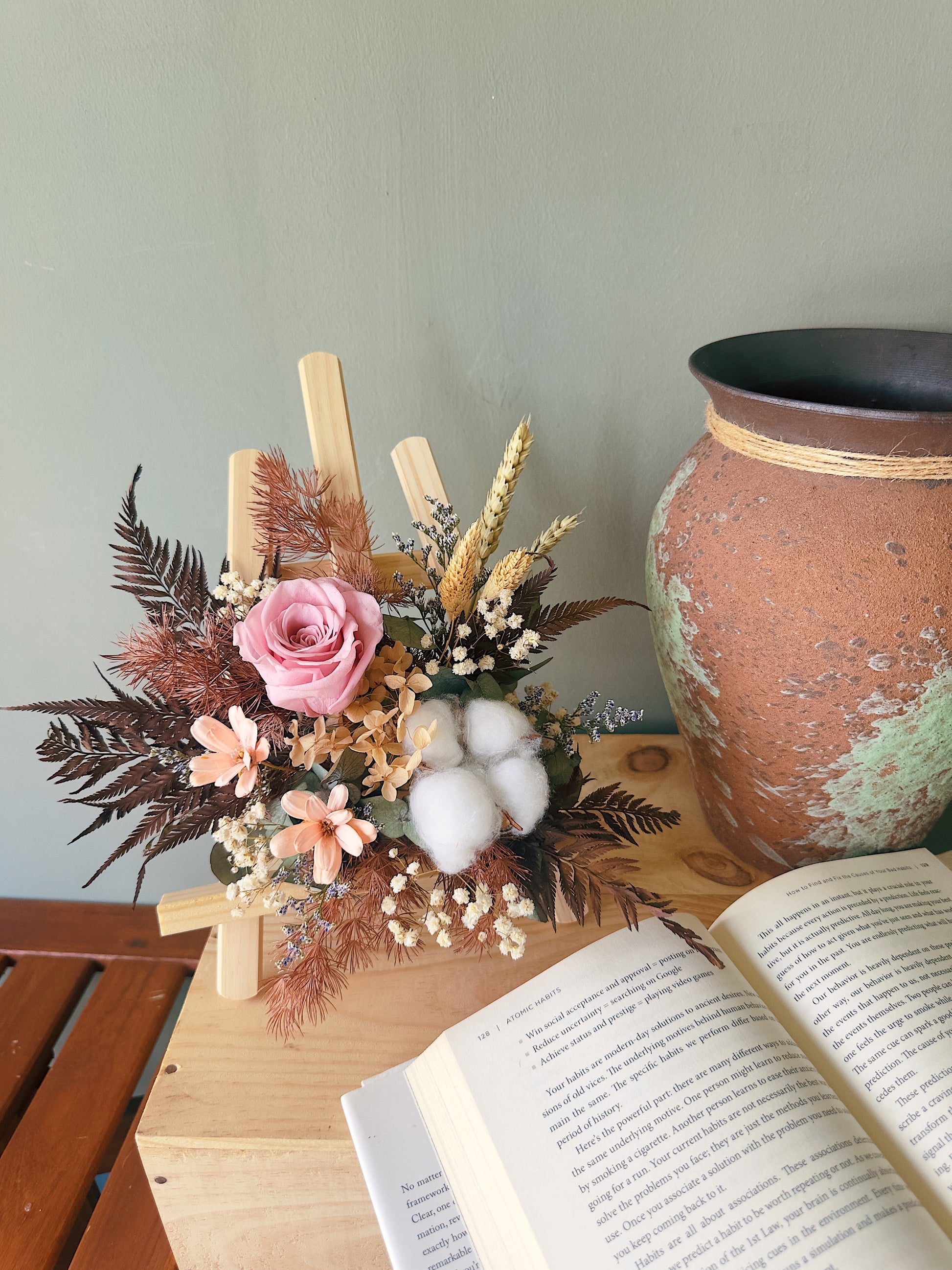 Displayed on an easel stand, this arrangement measures approximately 23cm (W) x 30cm (H) and features a harmonious selection of preserved and dried botanicals: