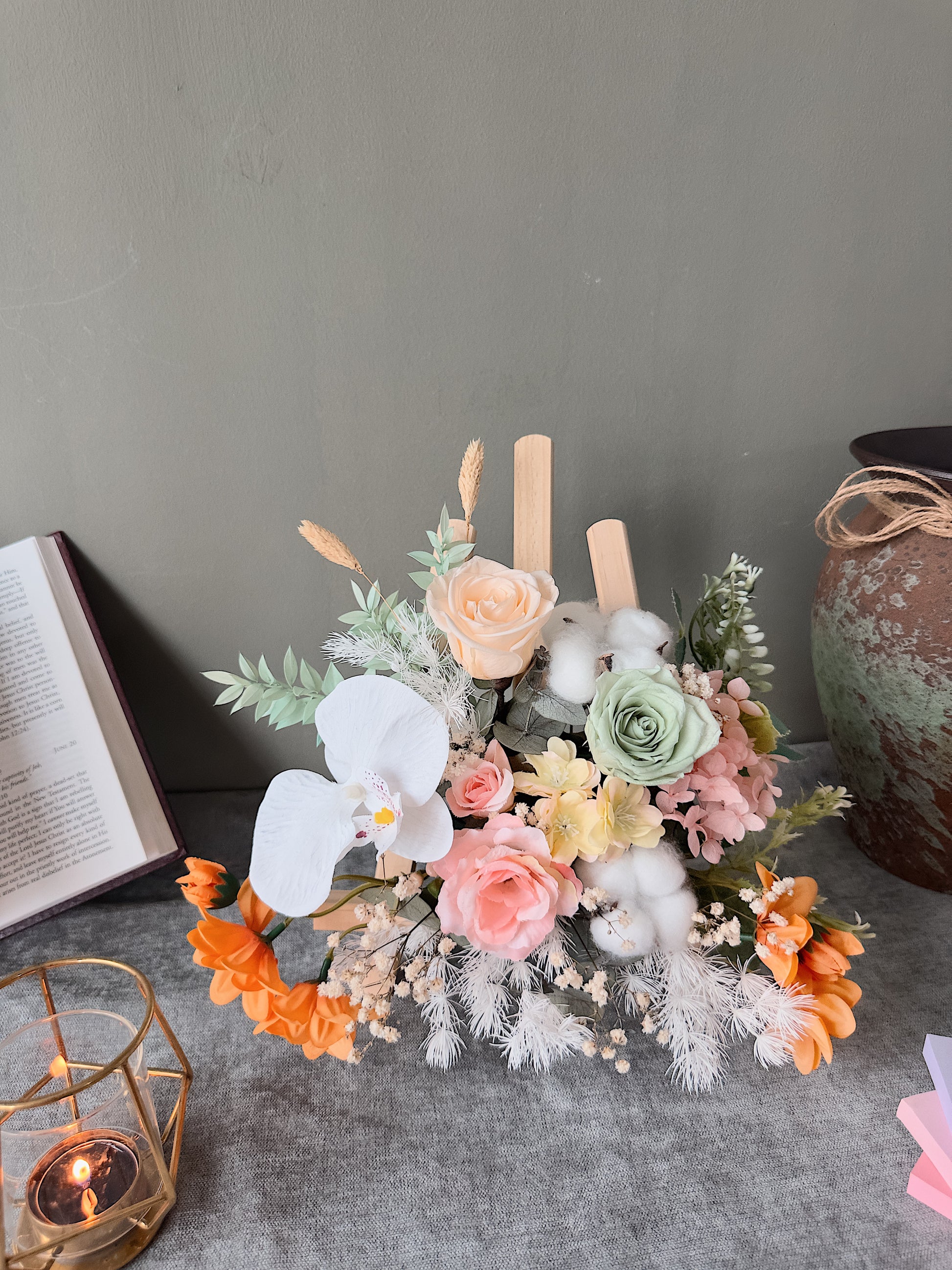 Soft, delicate, and effortlessly soothing, Morning Hush captures the essence of a peaceful spring morning. Inspired by the gentle embrace of nature, this arrangement blends pastel hues with airy textures, evoking a sense of renewal, warmth, and quiet elegance. Like a soft breeze carrying the scent of fresh blossoms, it brings harmony and grace into any space.