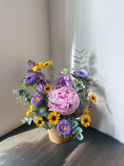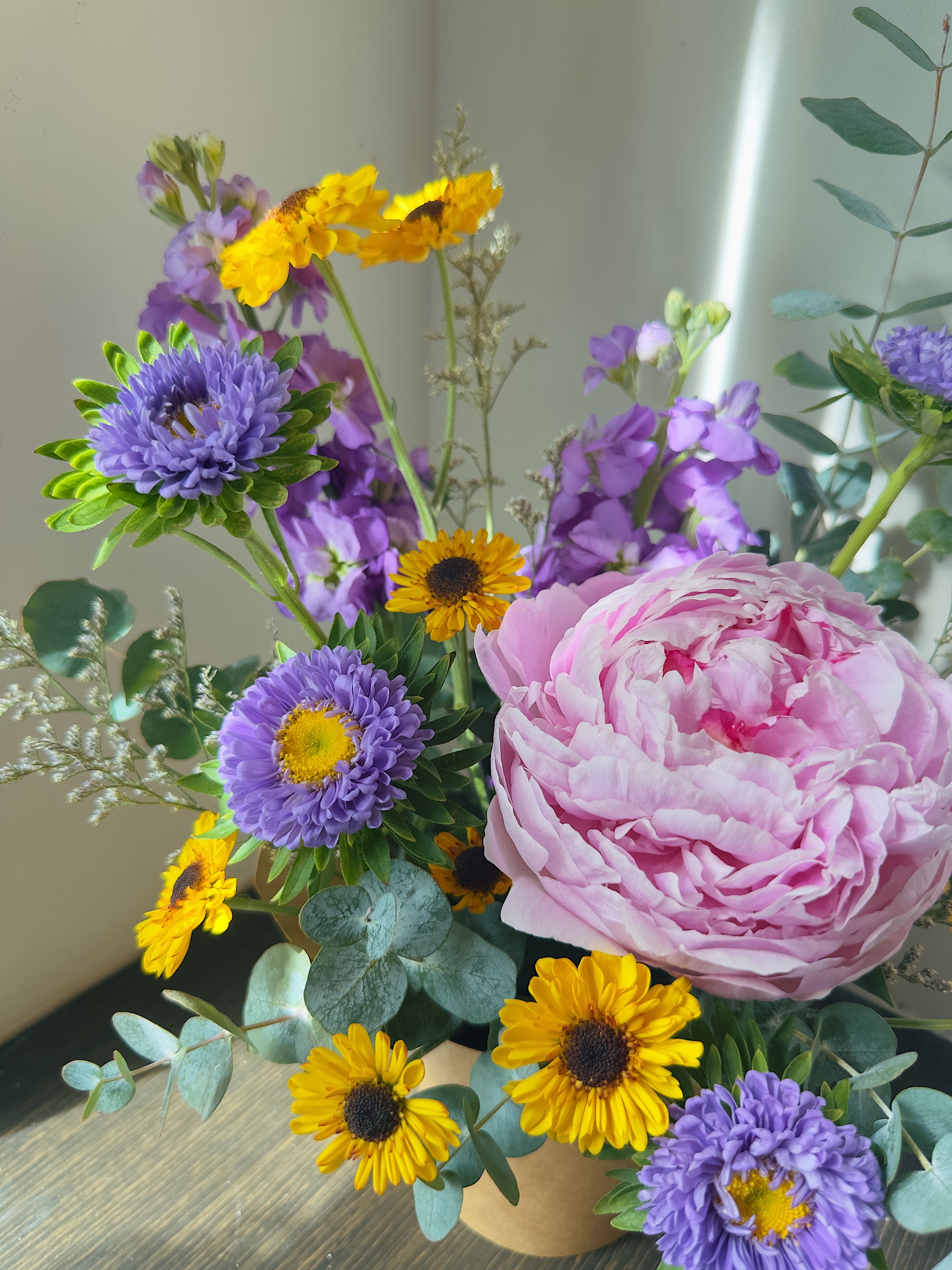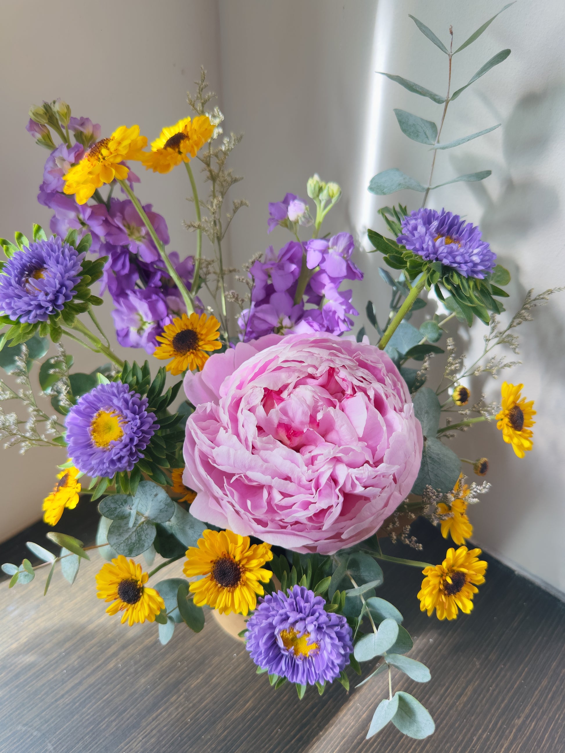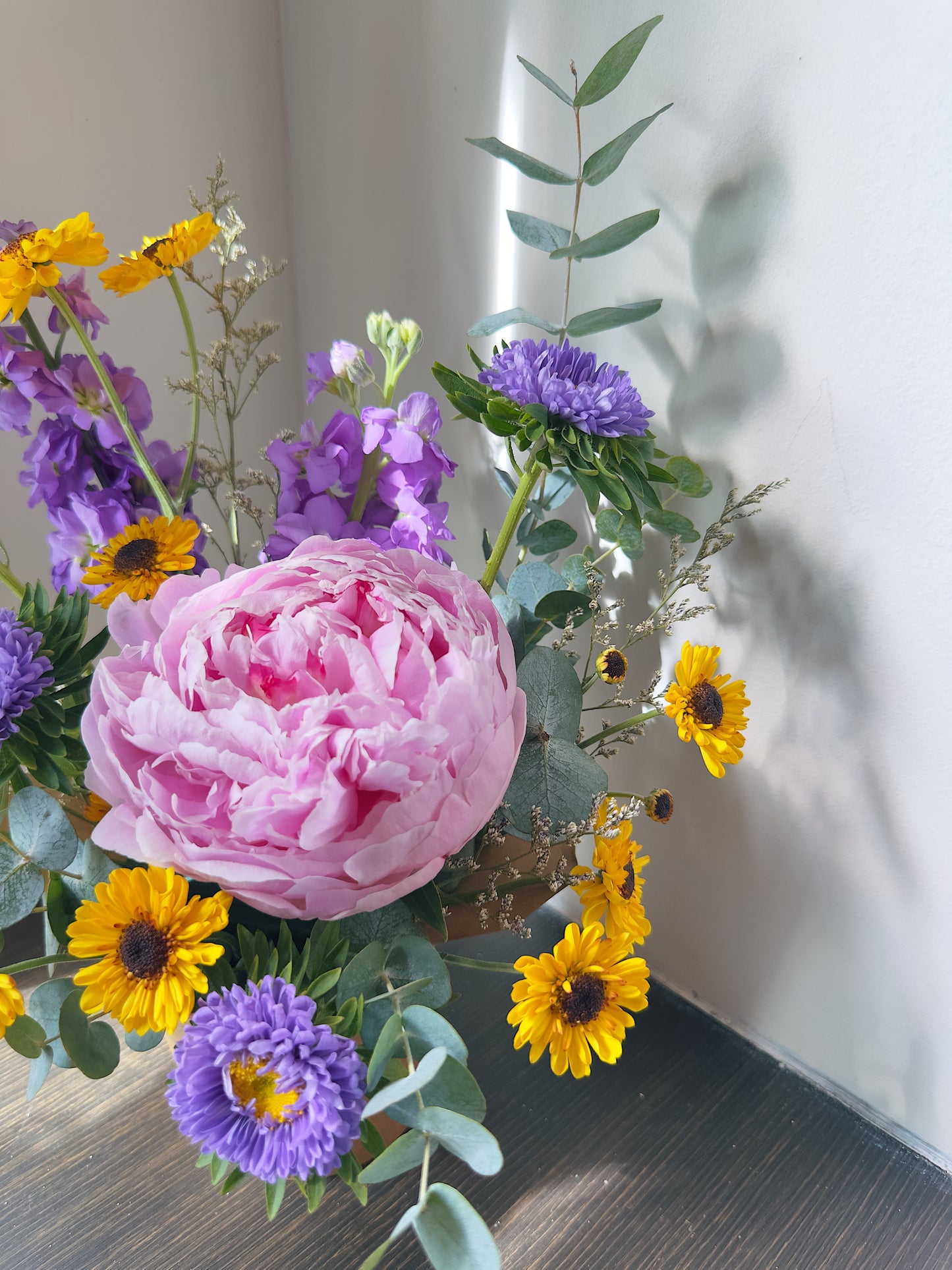 Peaceful is a graceful expression of calm and beauty — a floral arrangement designed to soothe the senses and brighten the soul. Featuring a lush pink peony as its centerpiece, it’s complemented by gentle yellow daisies, purple asters, delicate matthiolas, eucalyptus, and soft caspia for texture.