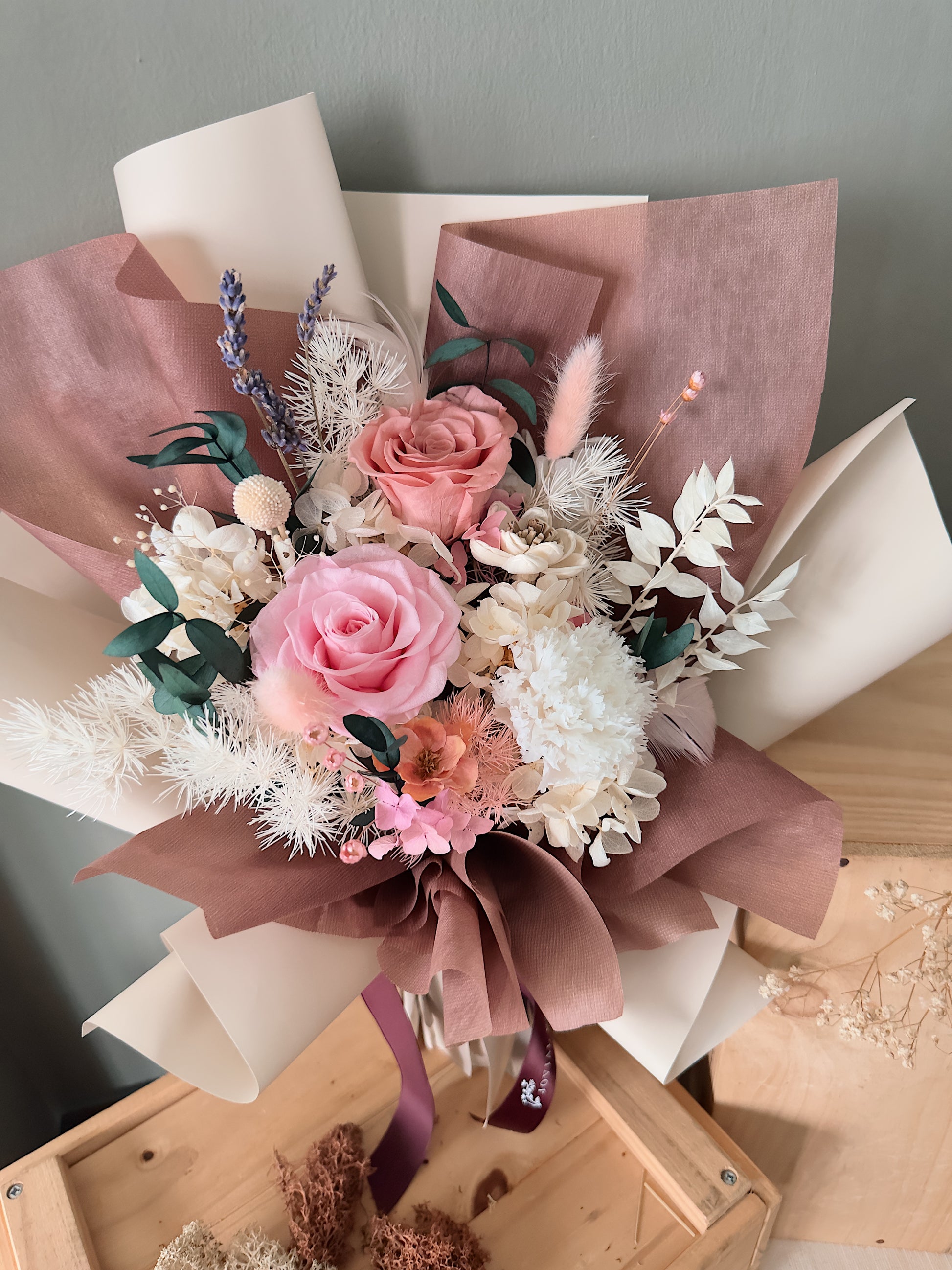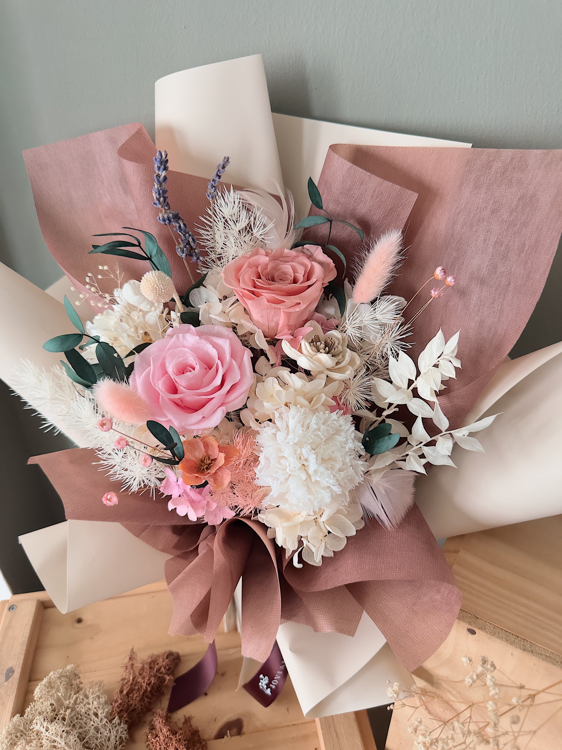 At its heart are two preserved pink roses and a single carnation, embraced by a tender medley of hydrangea, eucalyptus, ming fern, bunny tail, billy button, ruscus, and other airy fillers β creating a bouquet rich in texture, grace, and enduring beauty.