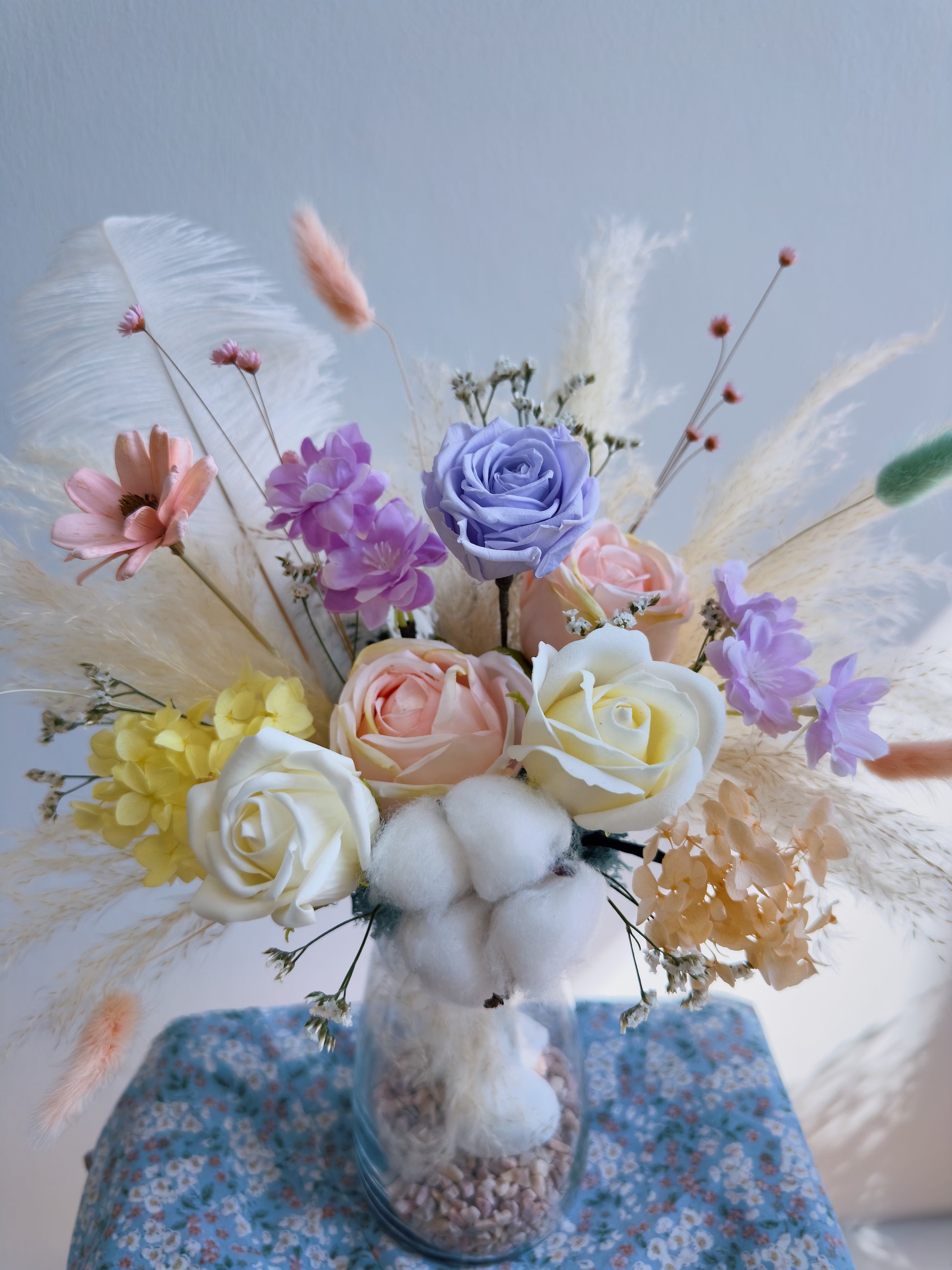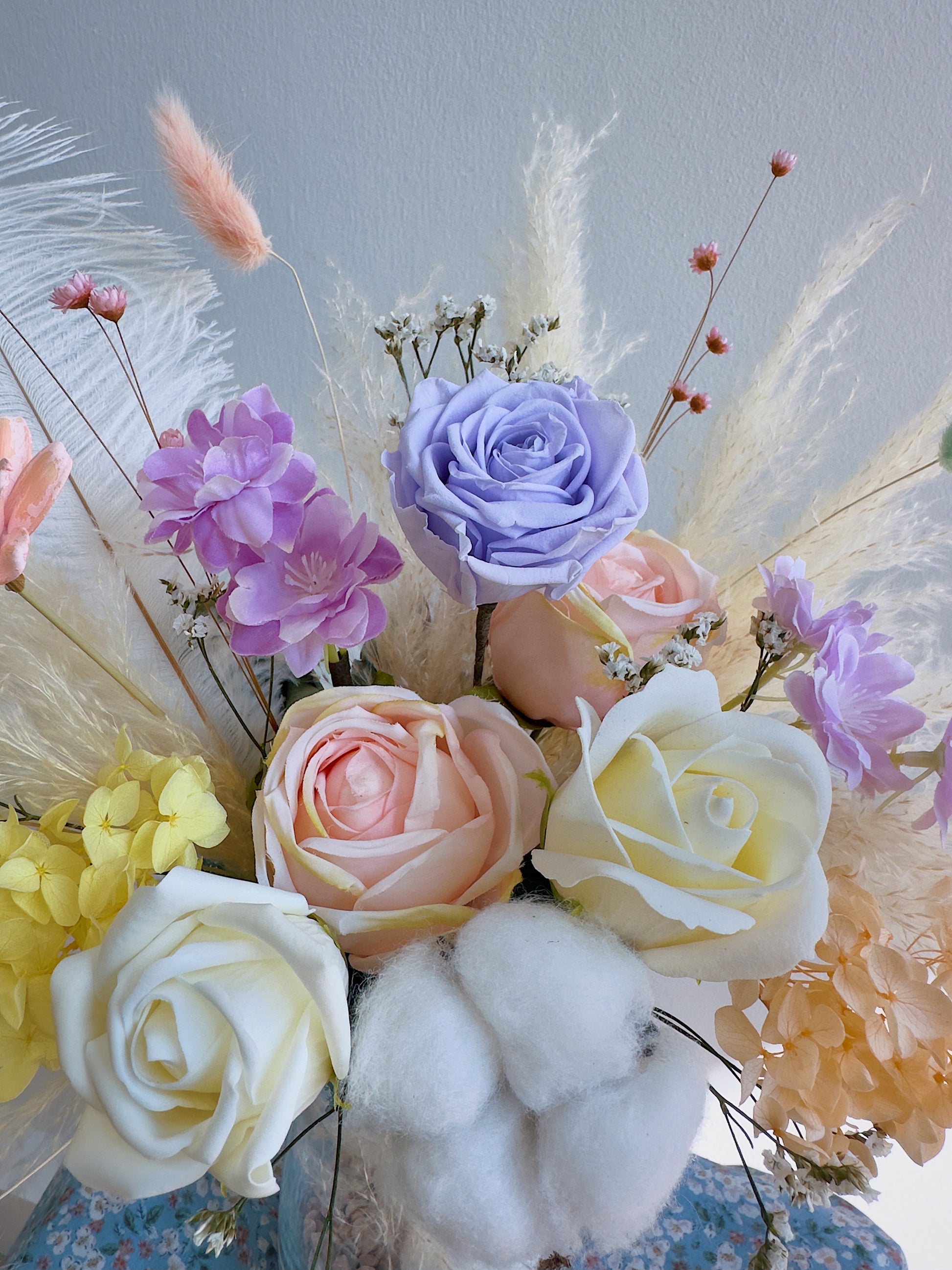 Preserved yellow and champagne hydrangeas, lilac rose, and moss create a soft, dreamy foundation. Dried pink seed flowers, bunny tails, pampas, ostrich feather, and caspia bring light movement and texture, adding a touch of playfulness. Faux garden rose and matthiola complete the palette with soft pastel tones that melt together like scoops of ice cream under the sun.