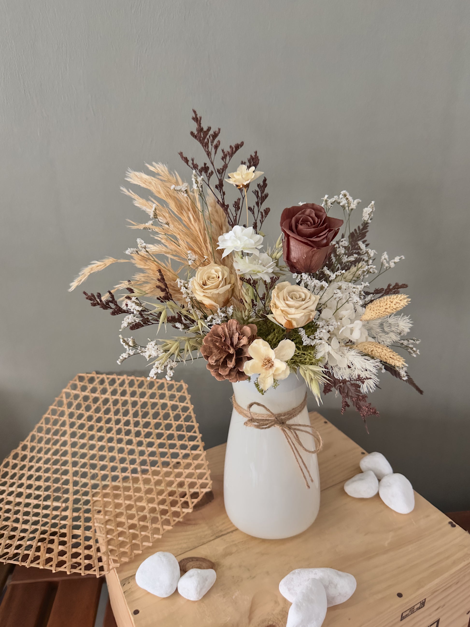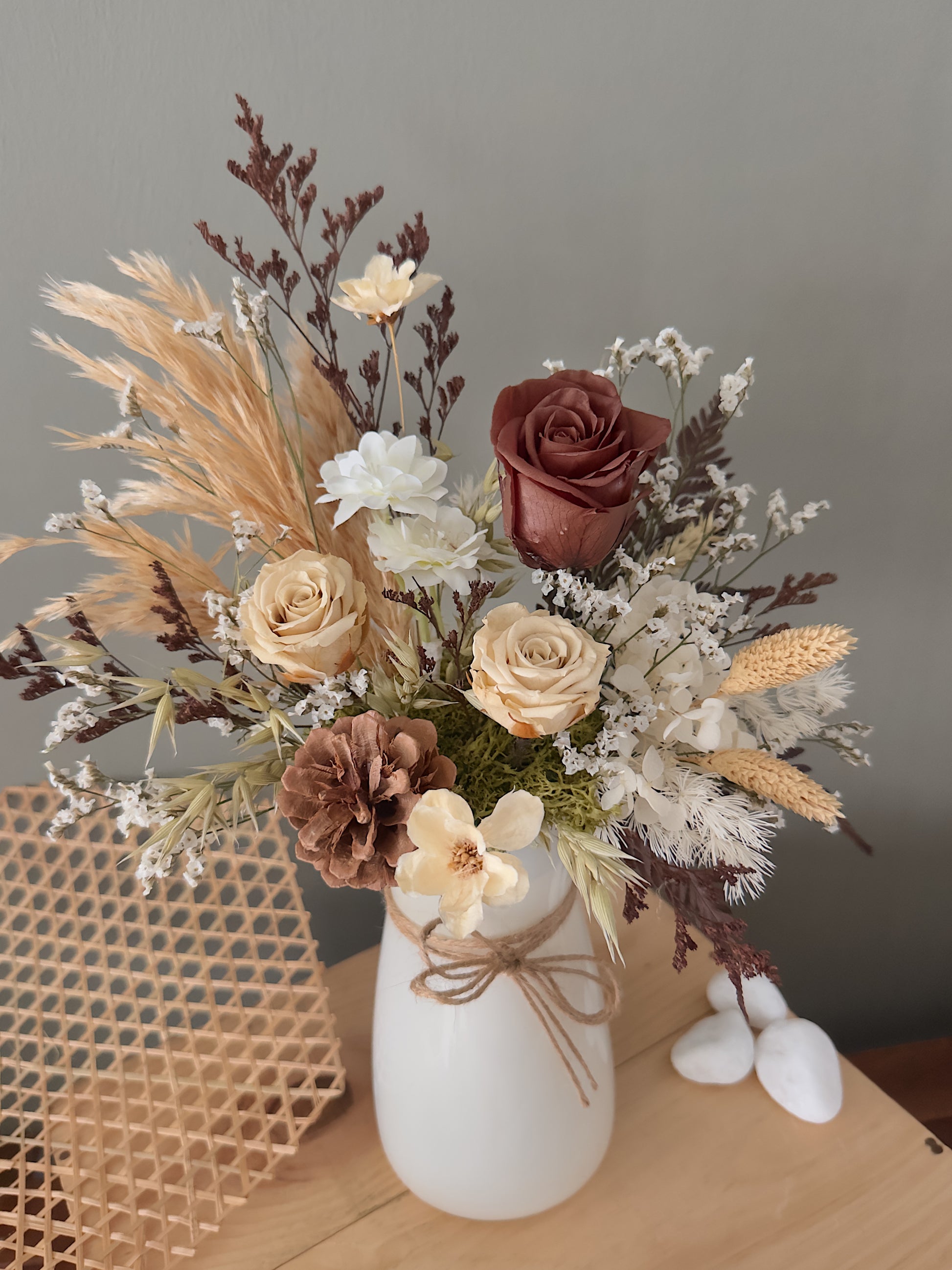 A single brown preserved rose is the centerpiece, flanked by two cream preserved roses, symbolizing warmth and quiet strength. Nestled around them are white hydrangeas, preserved moss, and pampas, adding softness and movement. Dried elements like avena oats, caspia, ming fern, and delicate ferns create layers of texture, while a pine cone and soft faux florals bring added depth and lasting charm.