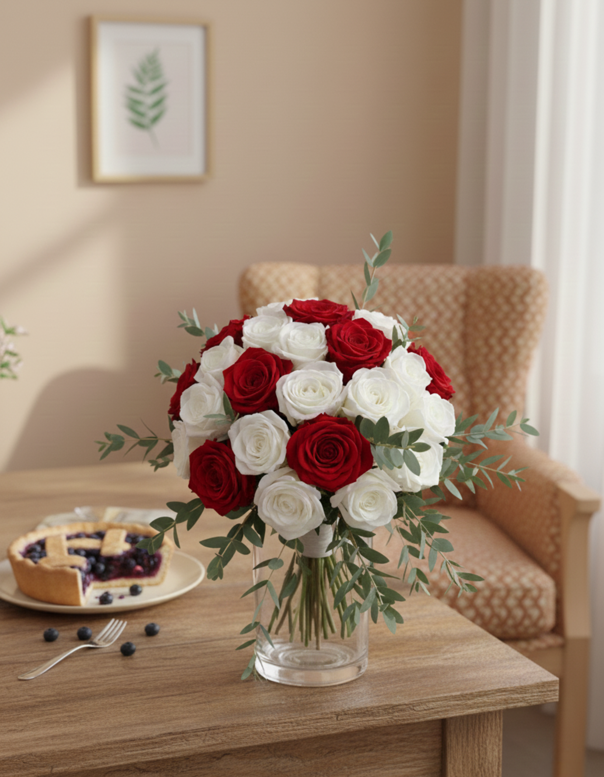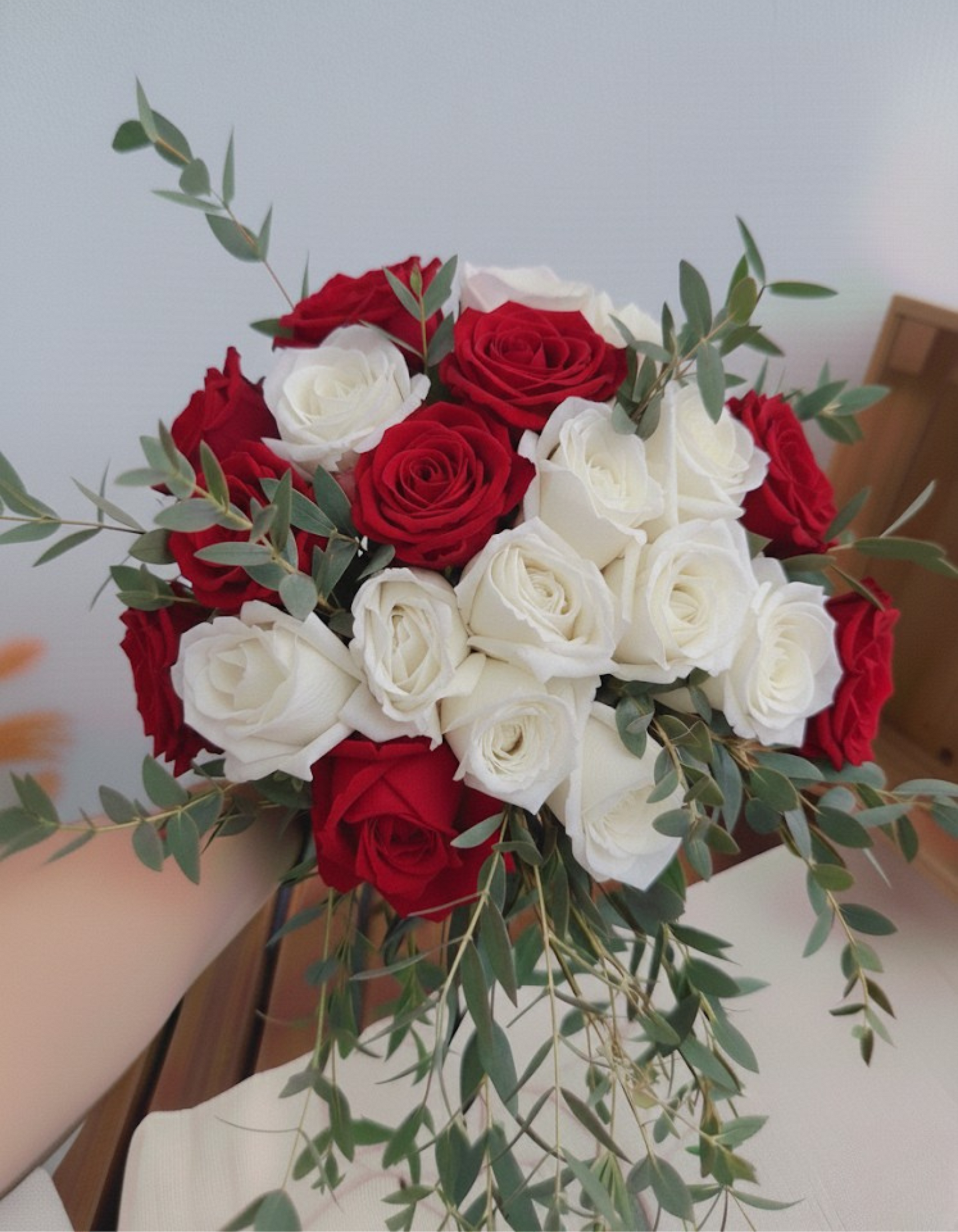 Red Velvet & Pearl features a refined pairing of fresh red and white roses complemented by airy eucalyptus parvifolia, creating a striking yet elegant arrangement. The bold richness of red roses contrasted with soft pearl-white blooms expresses love, purity, and heartfelt sincerity — perfect for romantic gestures, meaningful celebrations, or adding a classy touch to any space.