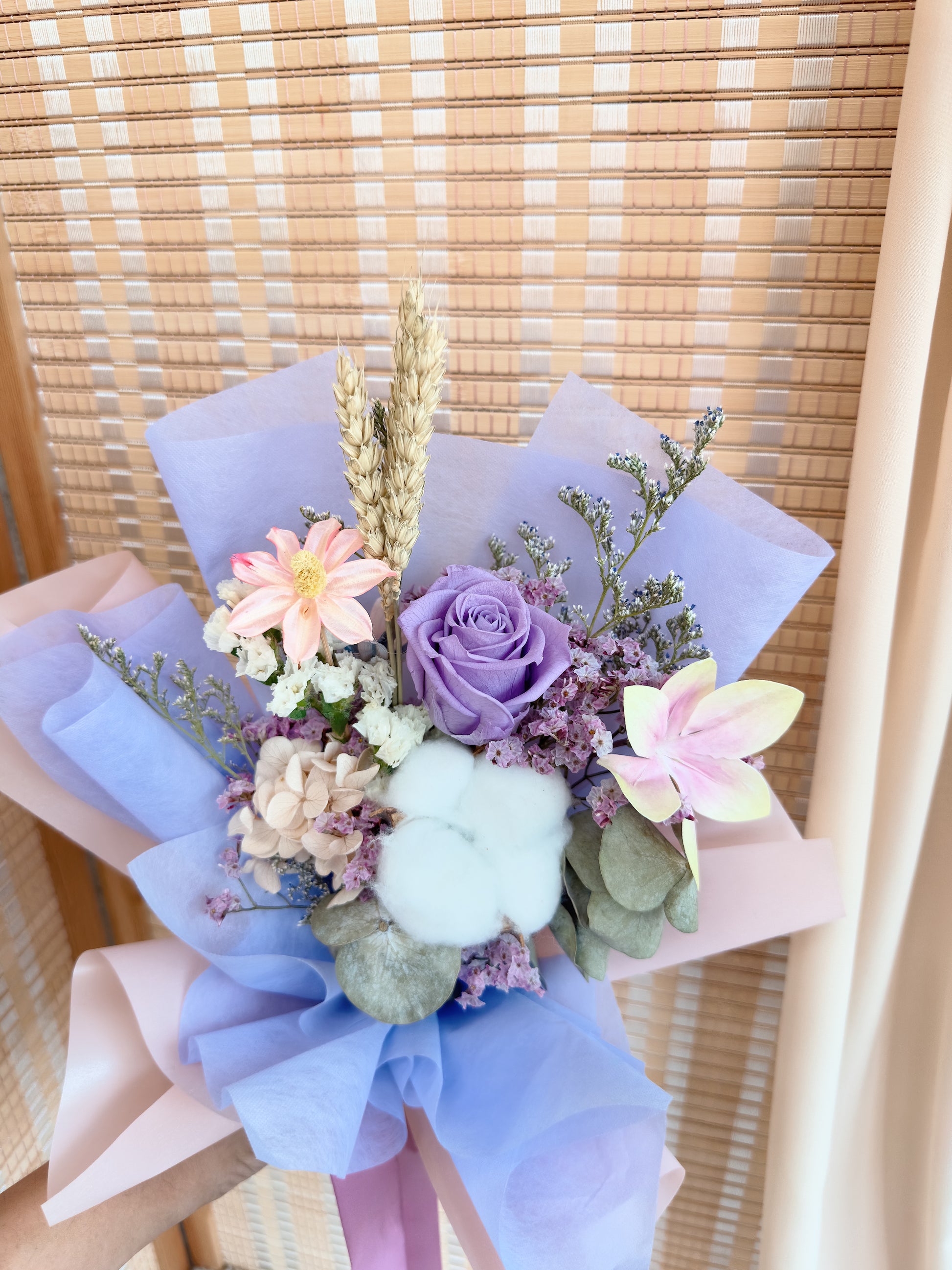 In this hand-tie bouquet, "Relentless Purple" in the Relentless series consists of a Purple rose, khaki hydrangeas, eucalyptus, pink man-made flower, cottons flower, wheat, faux flowers, bunny tail, statice, caspia and other fillers. Finish off with light pink wrapping.
