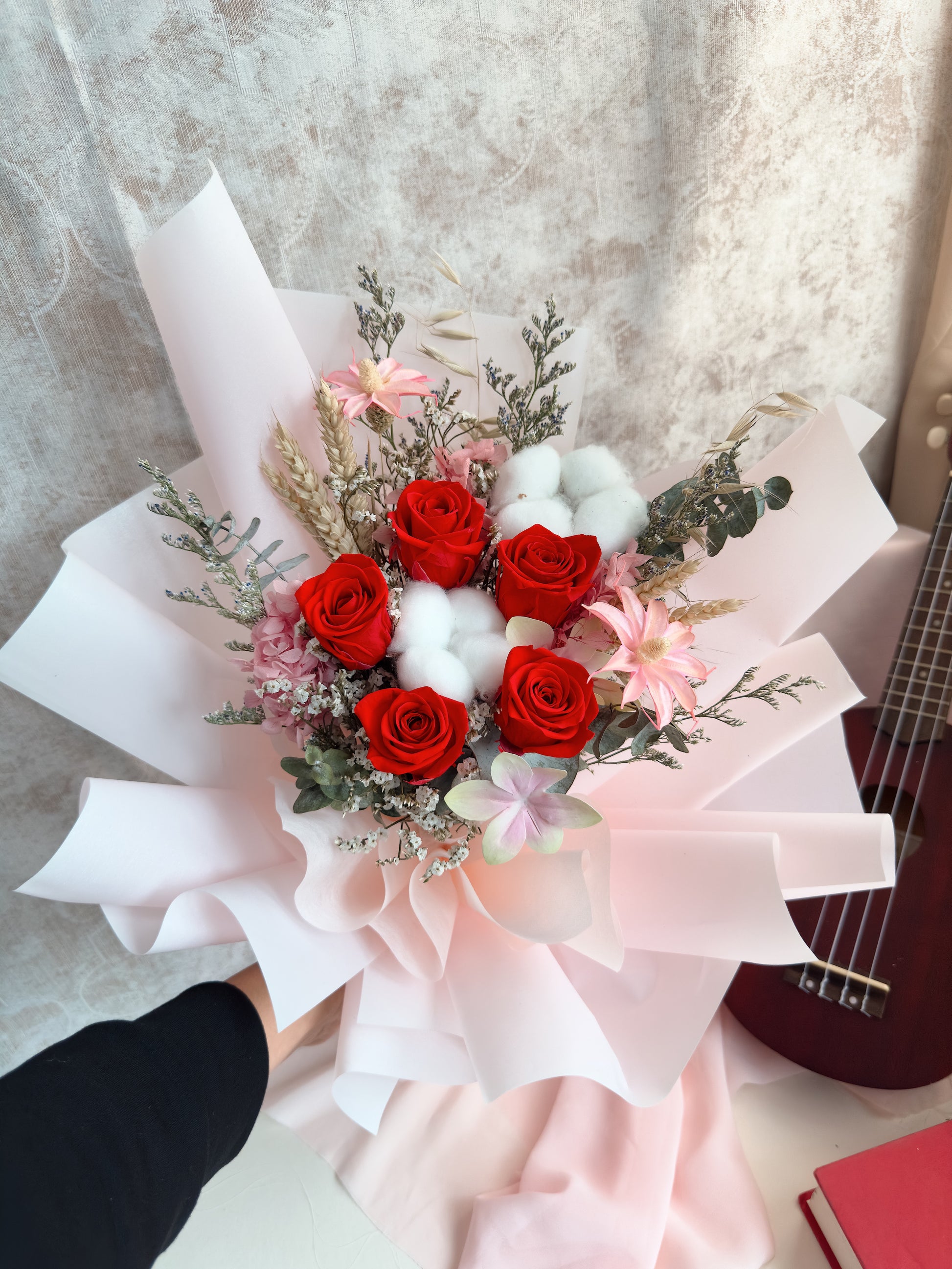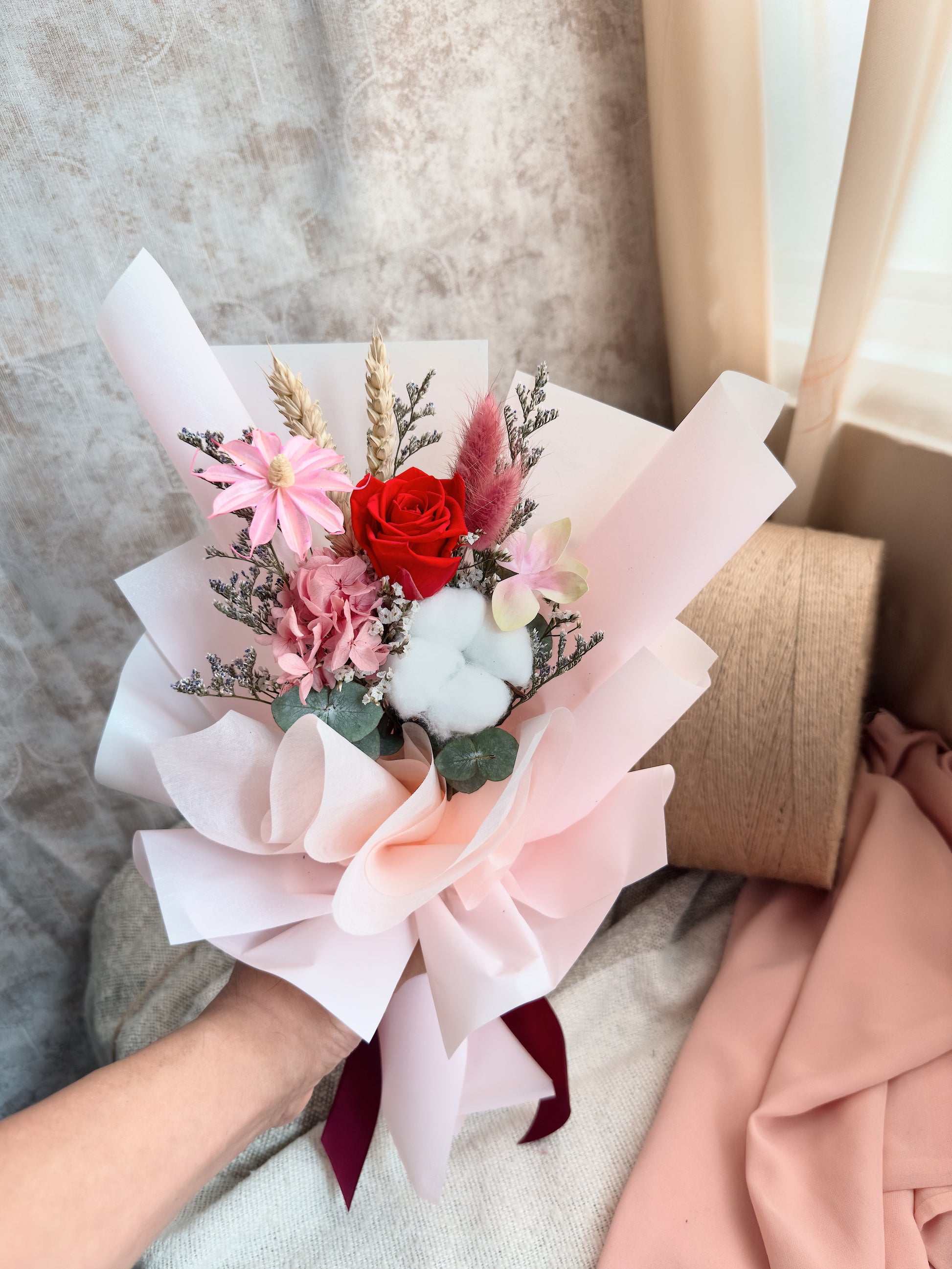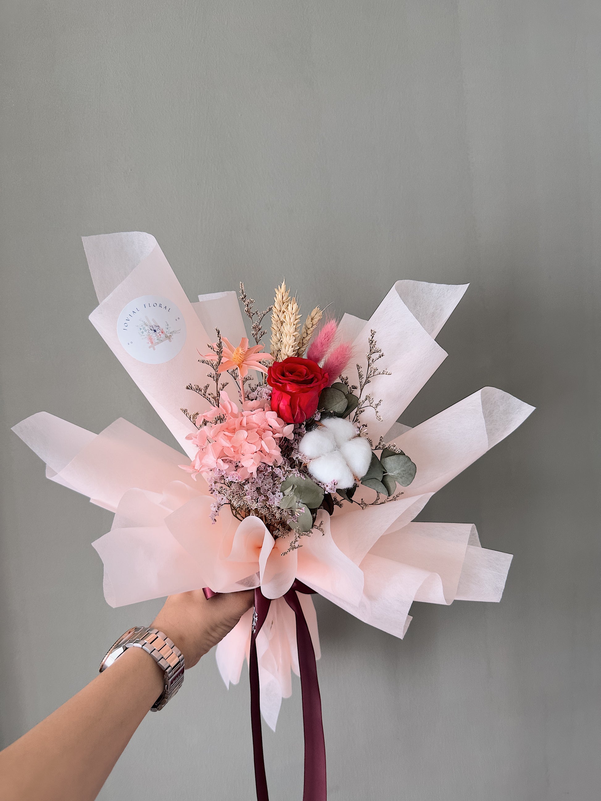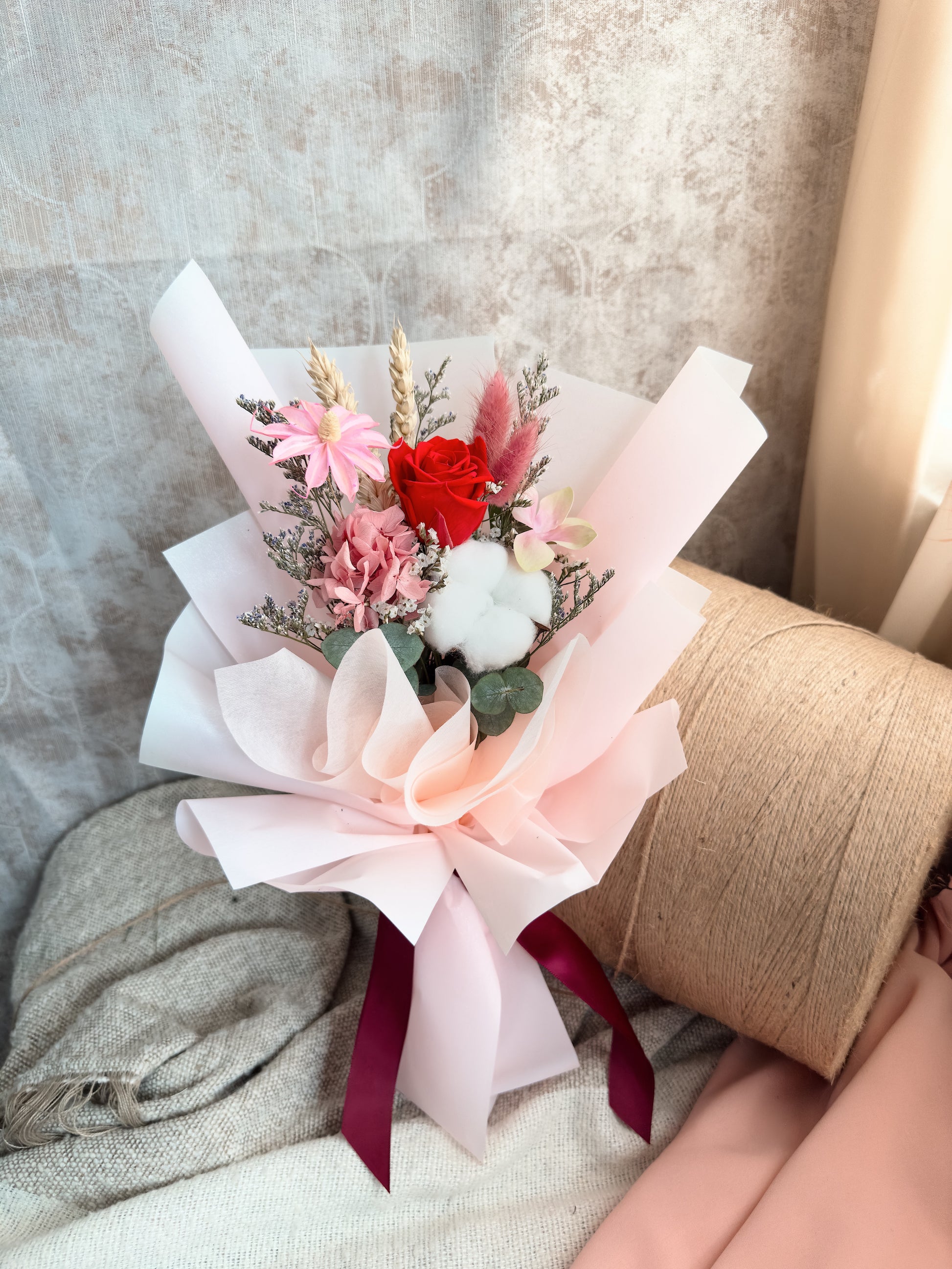 In this hand-tie bouquet, "Relentless Red" in the Relentless series consists of a red rose, pink hydrangeas, eucalyptus, pink man-made flower, cottons flower, wheat, faux flowers, bunny tail, statice, caspia and other fillers. Finish off with light pink wrapping.