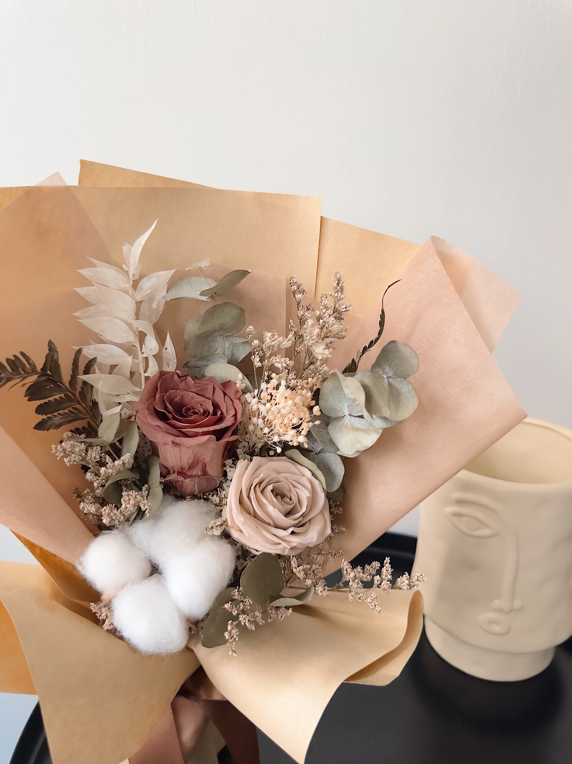 At its heart are preserved brown and khaki roses, embraced by soft cotton flowers, airy caspia, rustic vroom broom, lush eucalyptus, and delicate ruscus — a medley of textures that evokes a sense of calm, comfort, and refined charm.