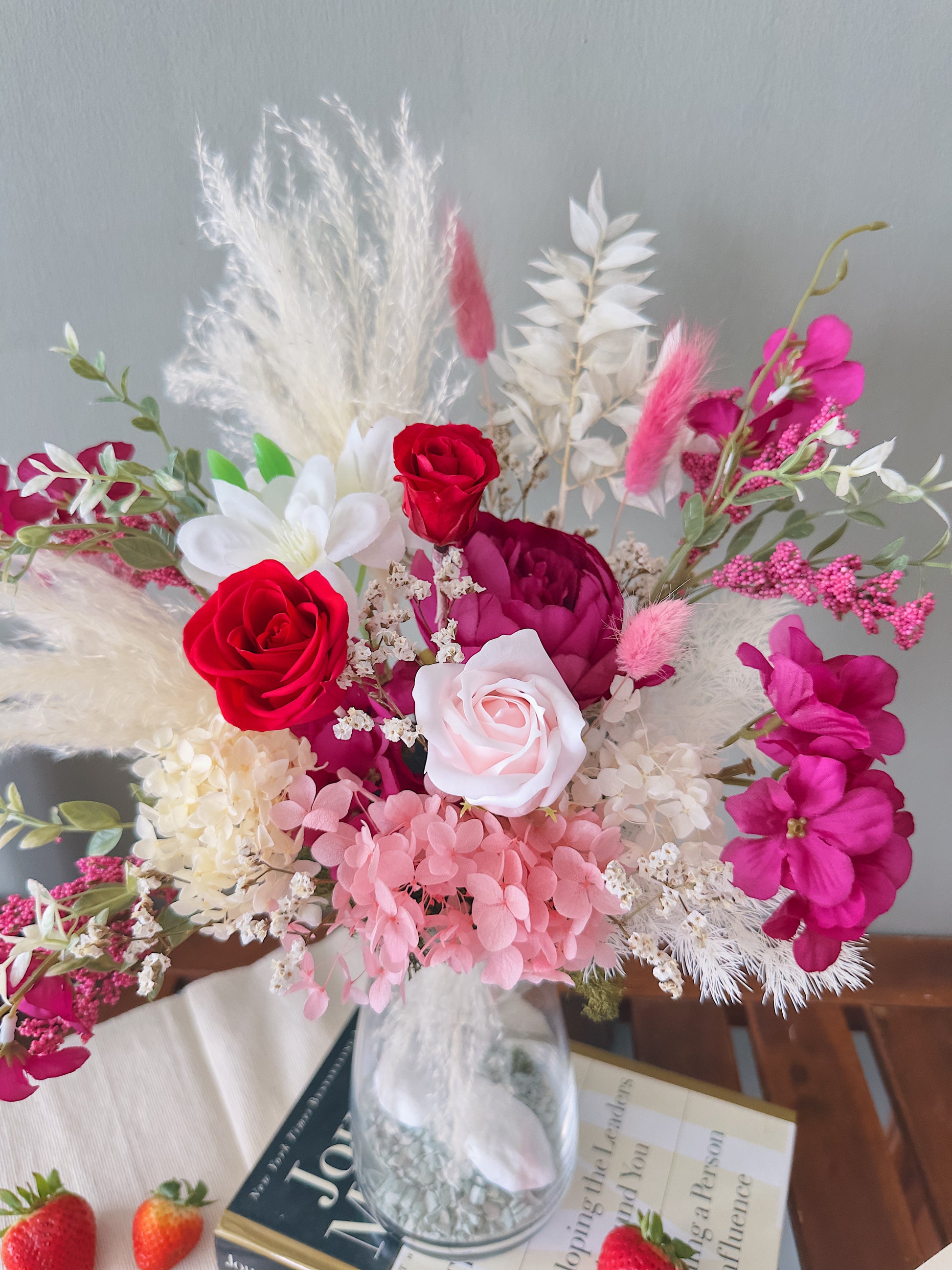 At its heart, this vibrant display features rich preserved red roses and delicate red spray roses, alongside a charming light pink soap rose, exuding timeless beauty. Lush faux fuchsia peonies and bountiful preserved pink and white hydrangeas provide dynamic pops of color and fullness. Soft, feathery pampas and bunny tails add airy lightness, while preserved white ruscus, preserved ming fern, preserved moss, and delicate caspia create intricate texture and depth. Thoughtfully integrated faux filler flowers complete this stunning composition, allowing its full spectrum of color and texture to shine.