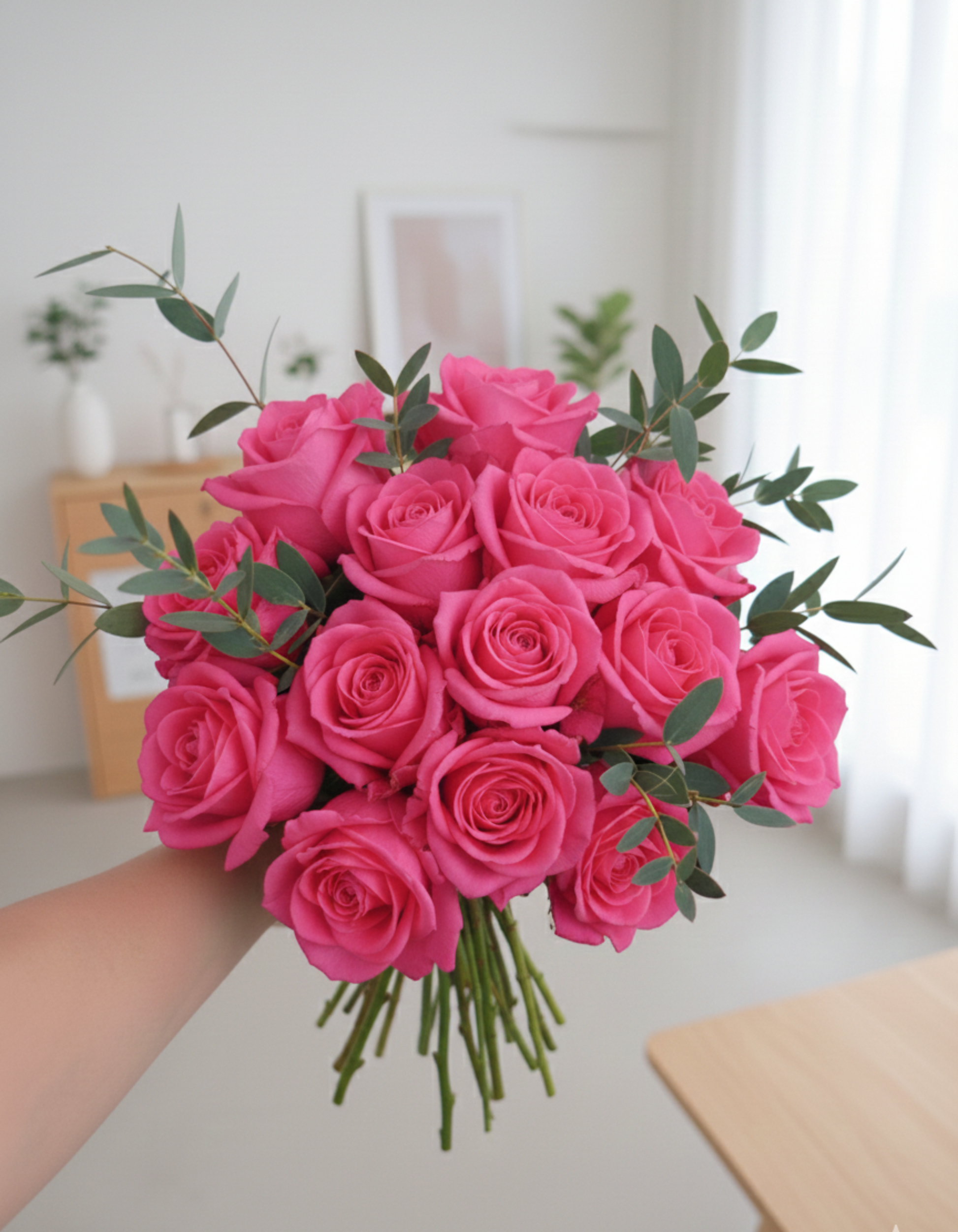Shocking Pink (Pomegranate) Elegant bursts with energy through its vivid shocking-pink roses, paired with soft eucalyptus parvifolia for balance and texture. Bright, lively, and eye-catching, this arrangement is perfect for celebrations, gifting, or adding a pop of colour to any space.