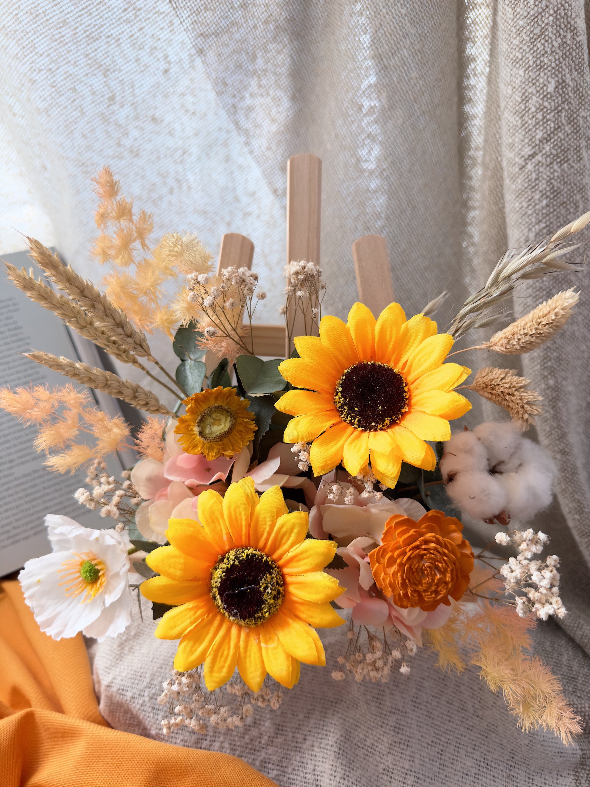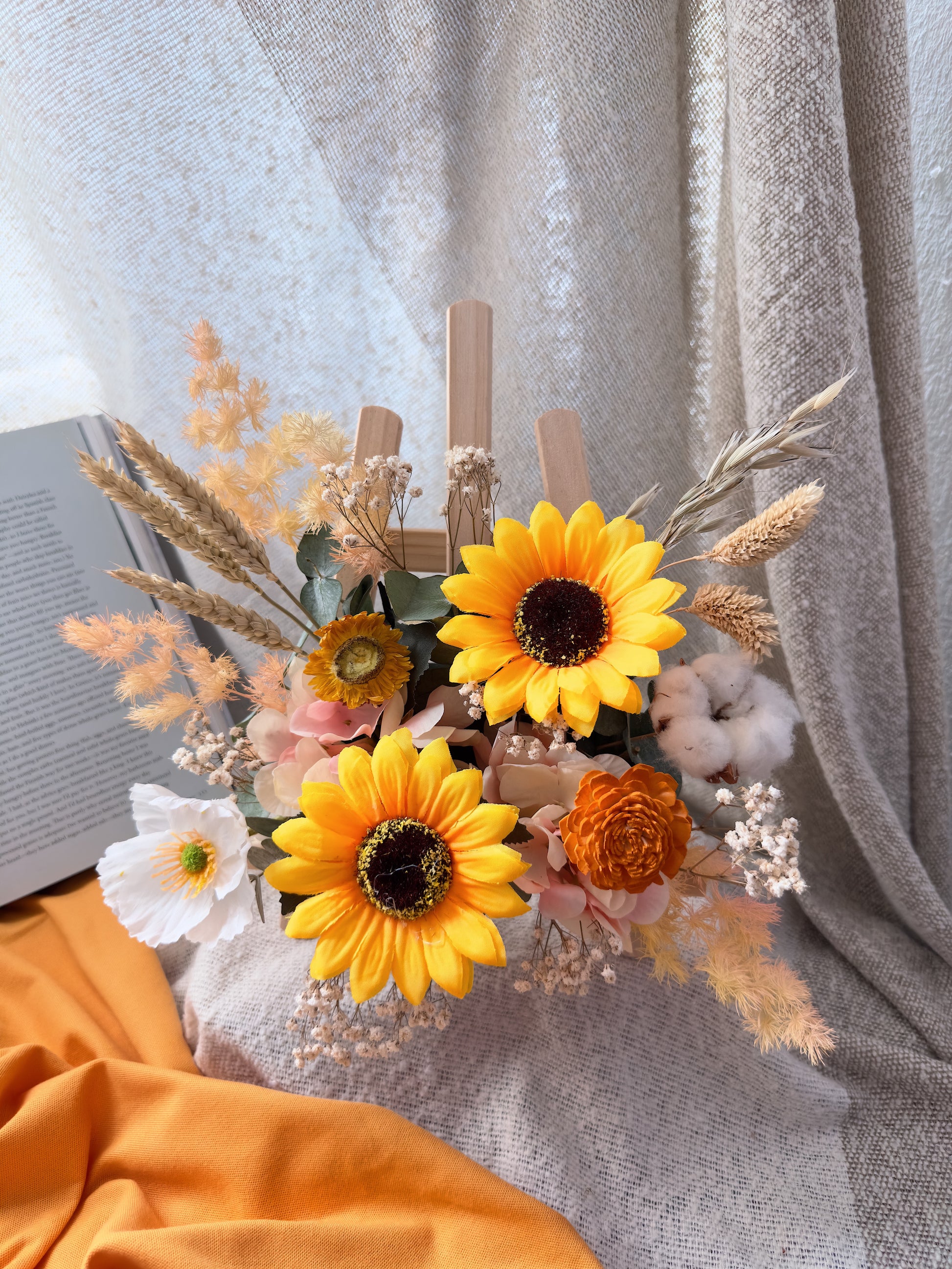 "Sunshine" consists of 2 faux sunflower, solar flower ,cotton flower, dried strawflower, faux hydrangea, faux anemone, mint fern, phalaris, eucalyptus, dried baby breath and other fillers. Finish off with easel stand.