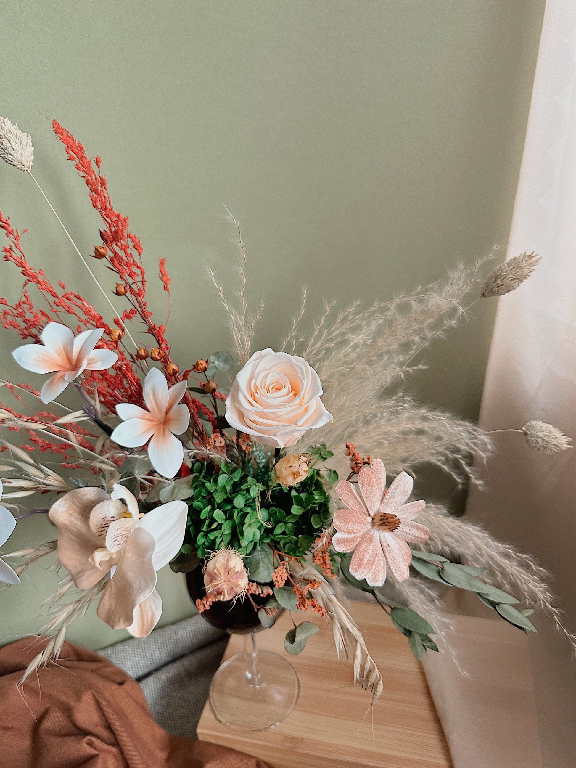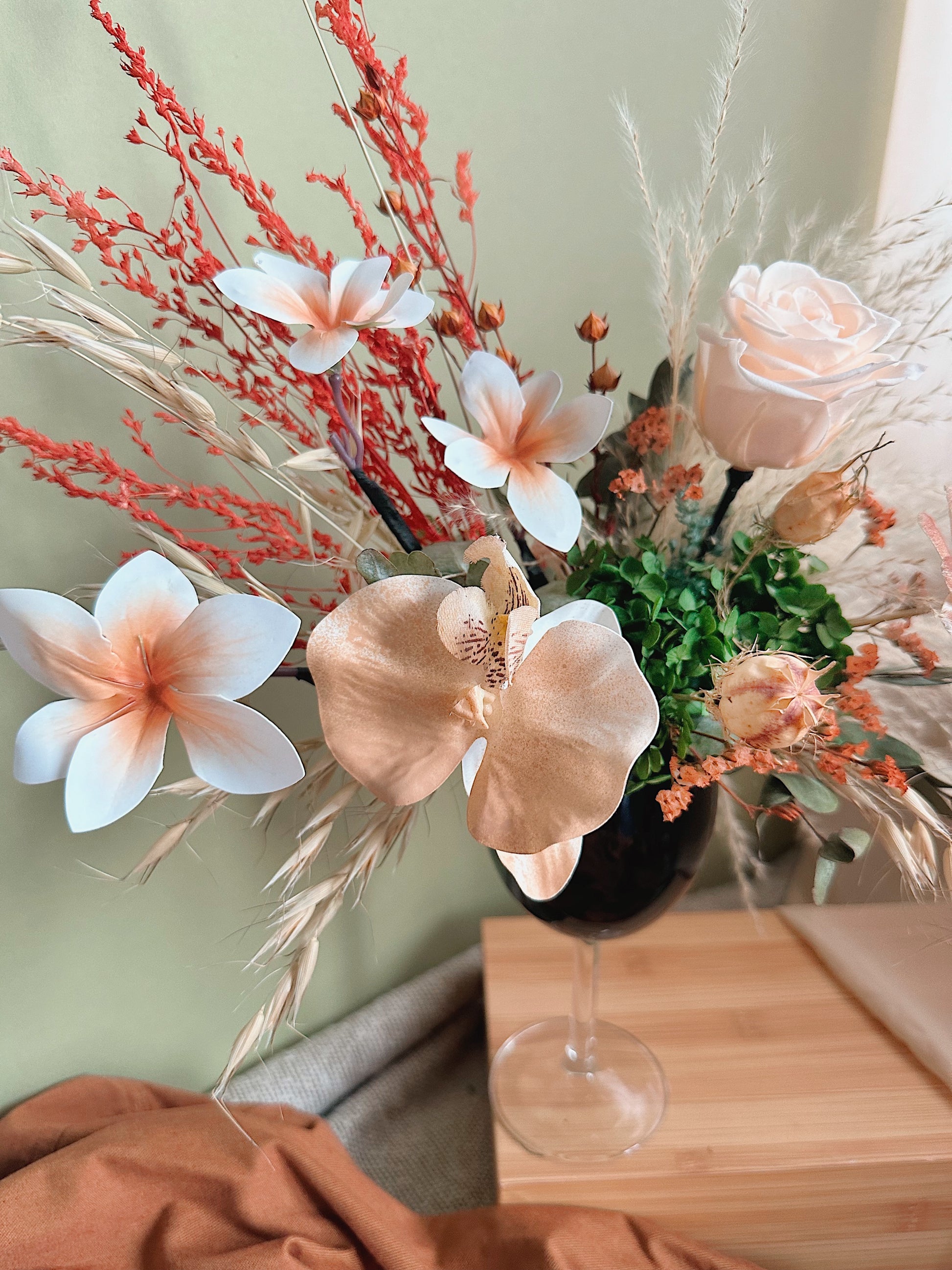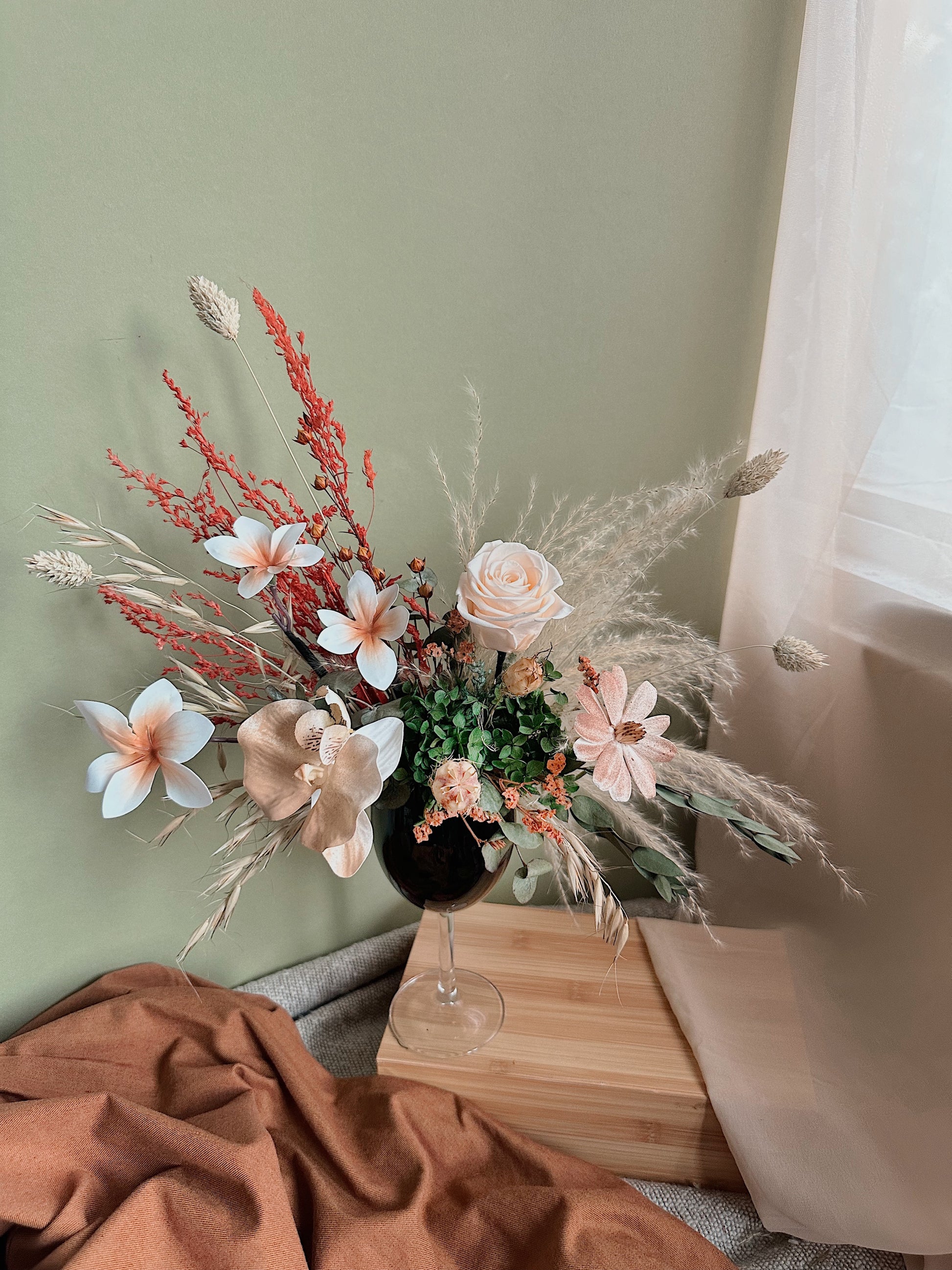 This “Unfailing Kindness” consists of a champagne preserved rose, green hydrangeas, man-made nuts flower, faux flower, linum usitatissimum flower, fuax phalaenopsis, pampas, oat, caspia, eucalyptus and other fillers.